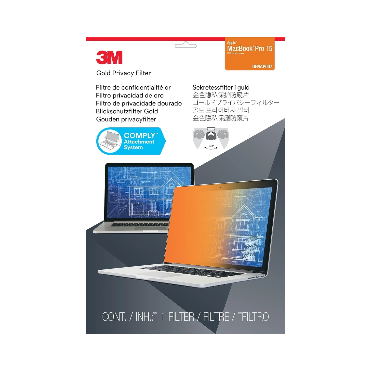 The 3M GFNAP007 is a gold privacy filter designed specifically for 15-inch MacBook Pro models from 2016 and newer. It protects sensitive information on your screen by limiting the viewing angle, so only the person directly in front of the laptop can see the content clearly. This filter enhances your viewing experience by delivering an image about twenty percent brighter and clearer than standard black privacy screens, while shielding your work from side glances in busy environments.