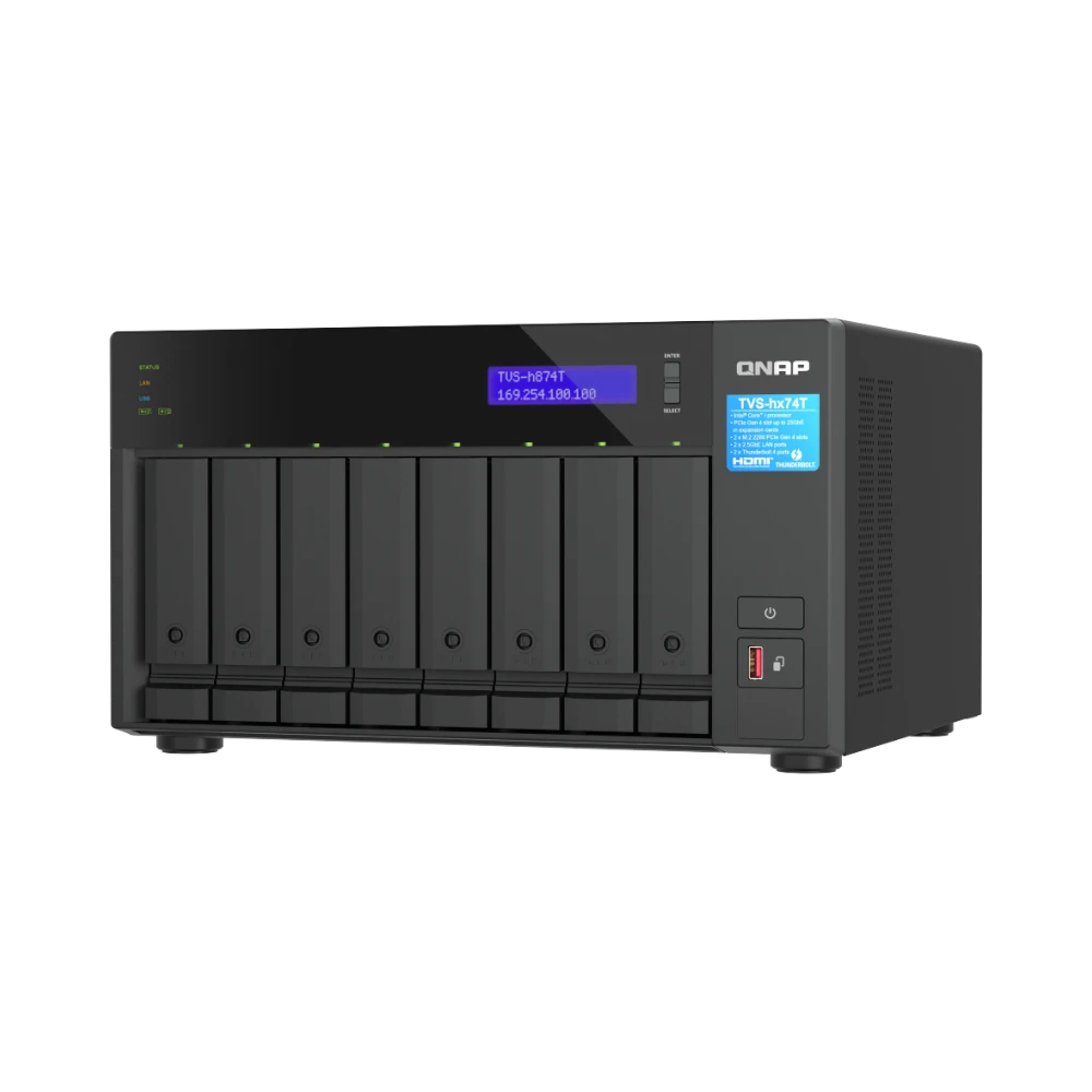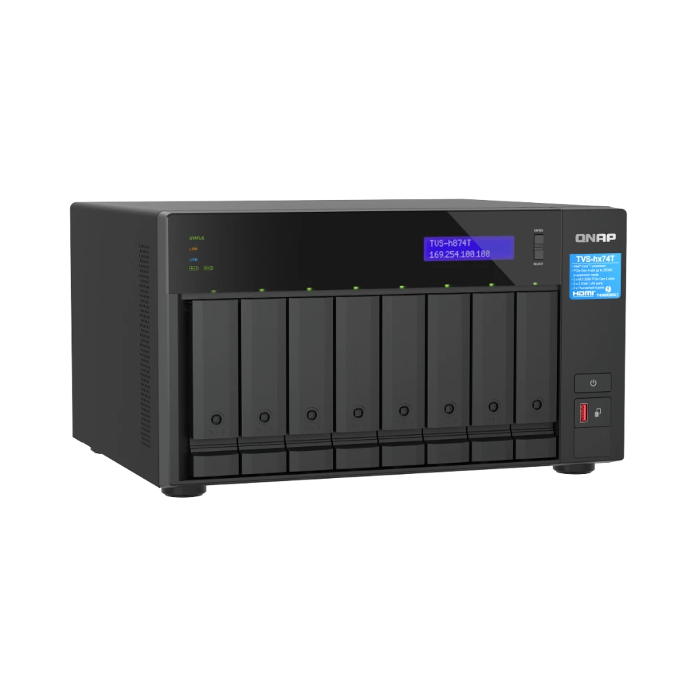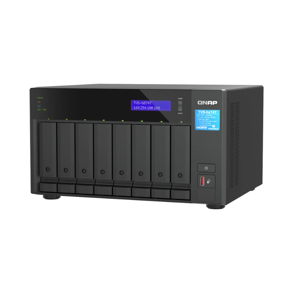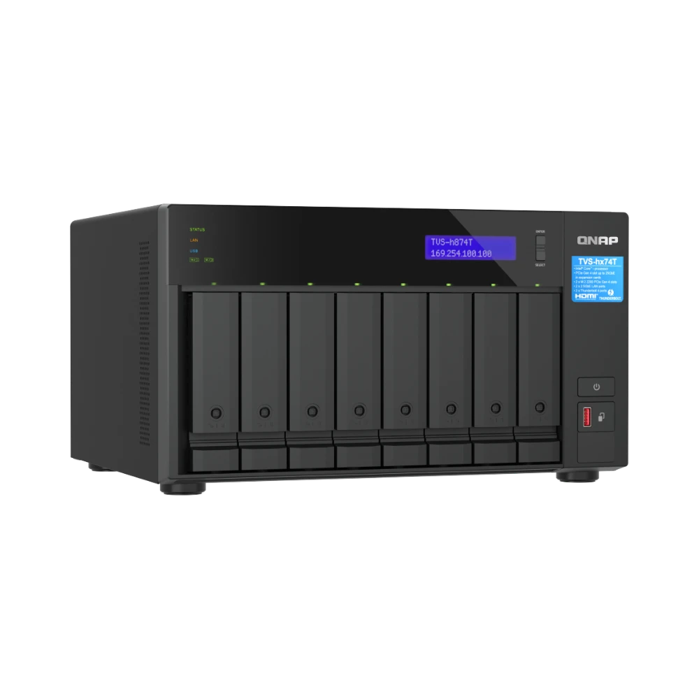 The QNAP TVS-H874T-I7-32G-US is an eight-bay desktop network attached storage enclosure designed to handle large file transfers and storage demands for creative teams and small businesses. Equipped with a 12th Gen Intel Core i7 processor featuring 12 cores and Intel UHD Graphics 770, it supports real-time 4K video editing, smooth media streaming, and multitasking for multiple users. This NAS offers flexible storage options with eight SATA drive bays and two M.2 NVMe SSD slots for caching or all-flash volumes, ensuring fast access to critical data.