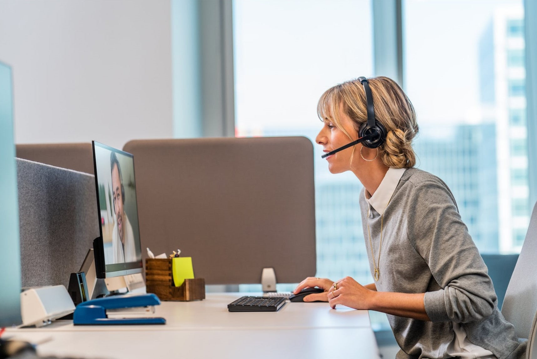 This headset is well suited to hybrid work environments where users split time between office and home. It supports professionals who need to move around their workspace without losing call quality, such as customer support agents, remote workers, and team members who participate in frequent video meetings. Its noise-canceling features and long battery life make it a strong choice for busy offices and home setups alike.
