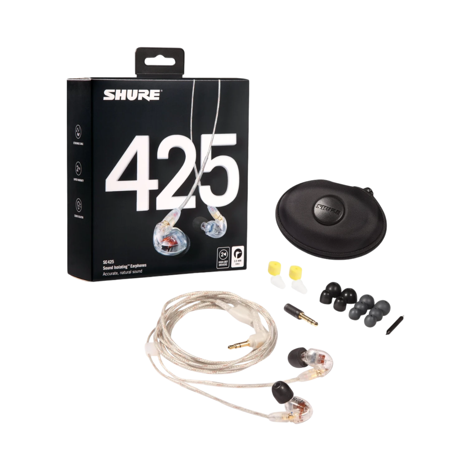 The Shure SE425-CL is a pair of in-ear stereo headphones designed to deliver precise and natural sound for critical listening in studios, on stage, or during travel. Featuring dual high-definition drivers in each earpiece, these headphones reveal subtle details in music and audio with clarity. Their sound isolation technology reduces ambient noise by up to 37 dB, allowing you to enjoy your audio at lower volumes and with better focus in noisy environments.