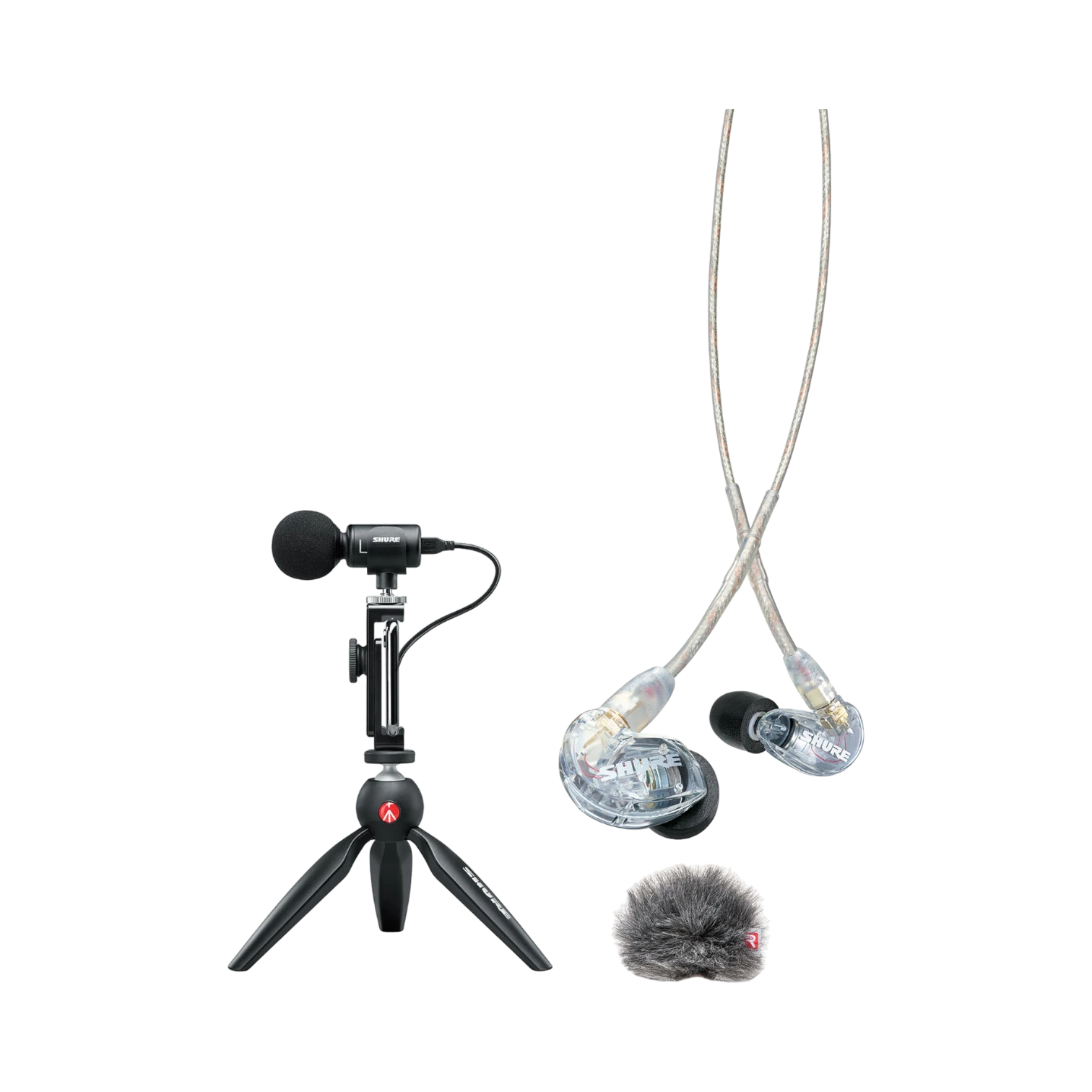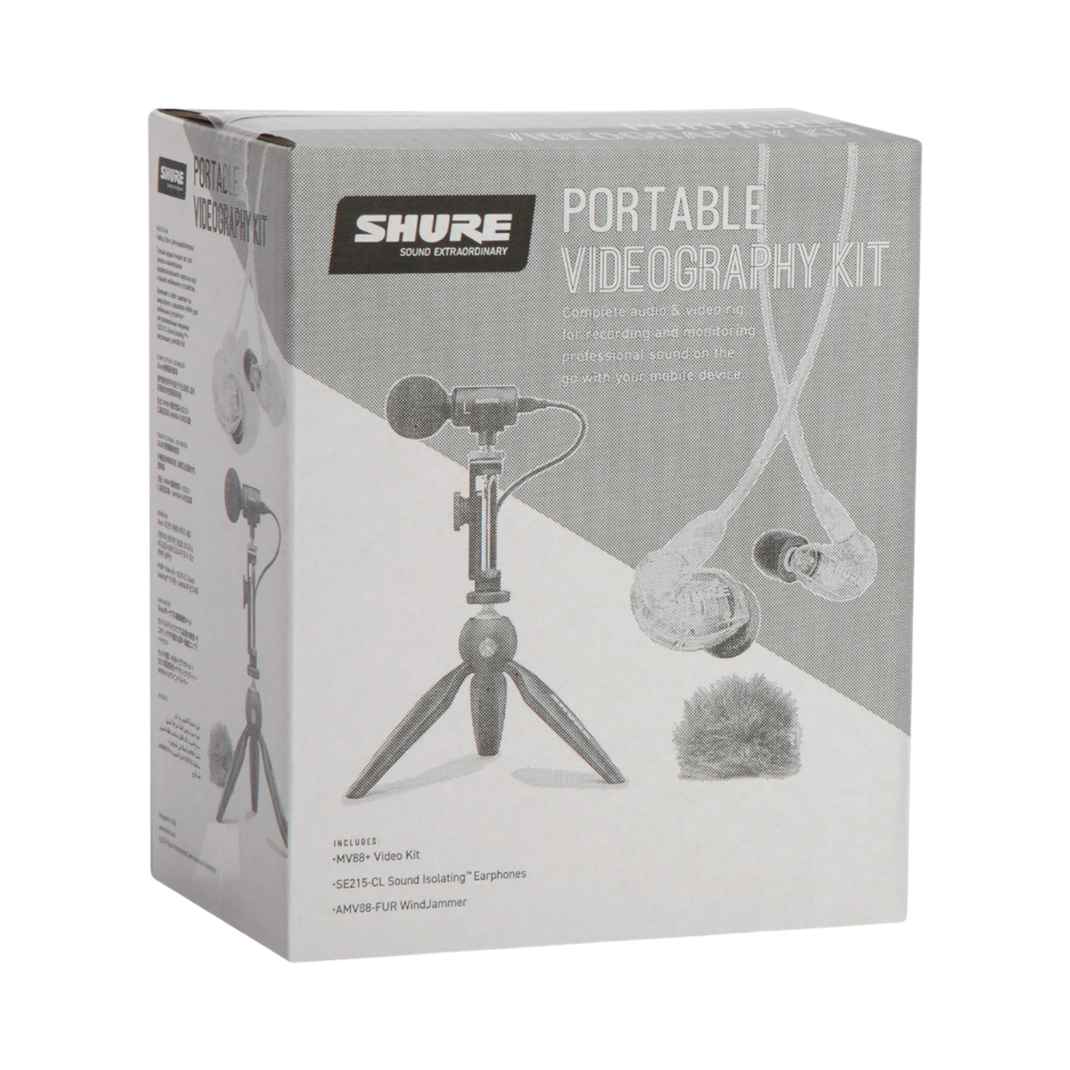 The Shure MV88+SE215-CL is a portable videography bundle designed to deliver high-quality audio and video capture for mobile creators. It combines the MV88+ stereo microphone, which connects seamlessly to iOS, Android, and desktop devices, with SE215 sound isolating earphones for precise real-time monitoring. This kit also includes a Manfrotto PIXI tripod, a phone clamp, and a fur windjammer to reduce wind noise, making it a complete solution for recording clear sound and stable video on the go.