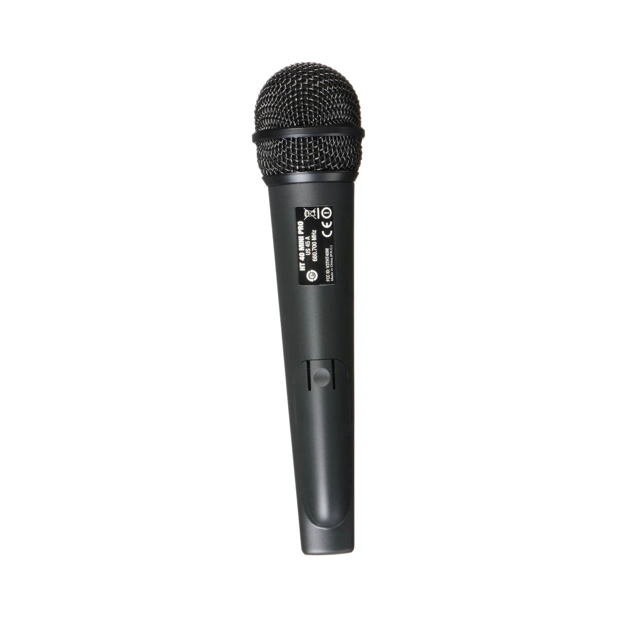 - HT 40 handheld microphone equipped with a metal cap for enhanced durability and an easy-to-use On, Off, Mute switch for managing sound discreetly