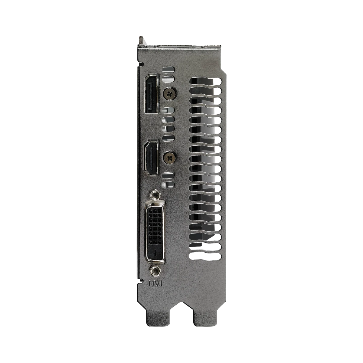 - Metal bracket with one HDMI 2.0, one DisplayPort 1.4, and one DVI-D output supports up to three displays, including VR headsets and living-room TVs without adapters.