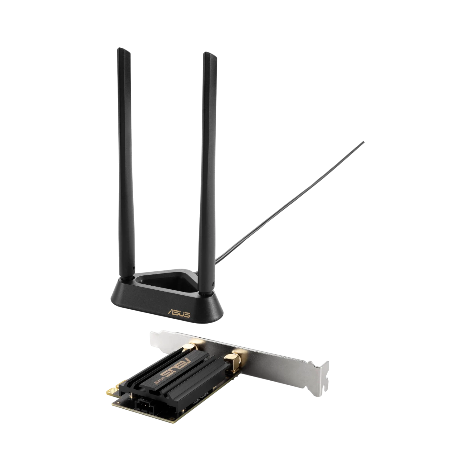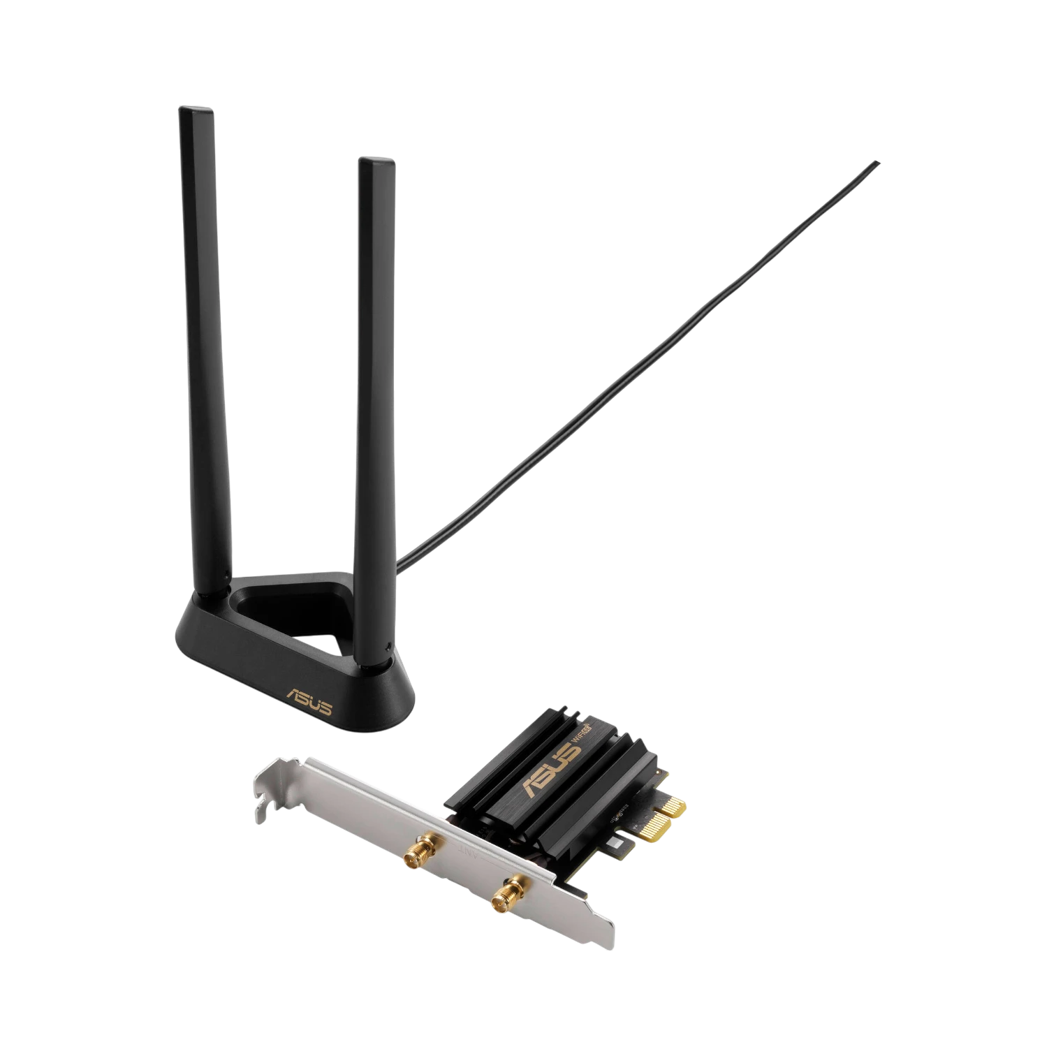 The adapter features two external antennas mounted on a magnetic base, allowing flexible placement on metal surfaces for improved signal strength. Its built-in Bluetooth 5.2 eliminates the need for separate dongles when connecting peripherals such as headsets and keyboards. Installation is simple, with options for standard or low-profile brackets to fit various desktop cases, and it offers full driver support on Windows 11.