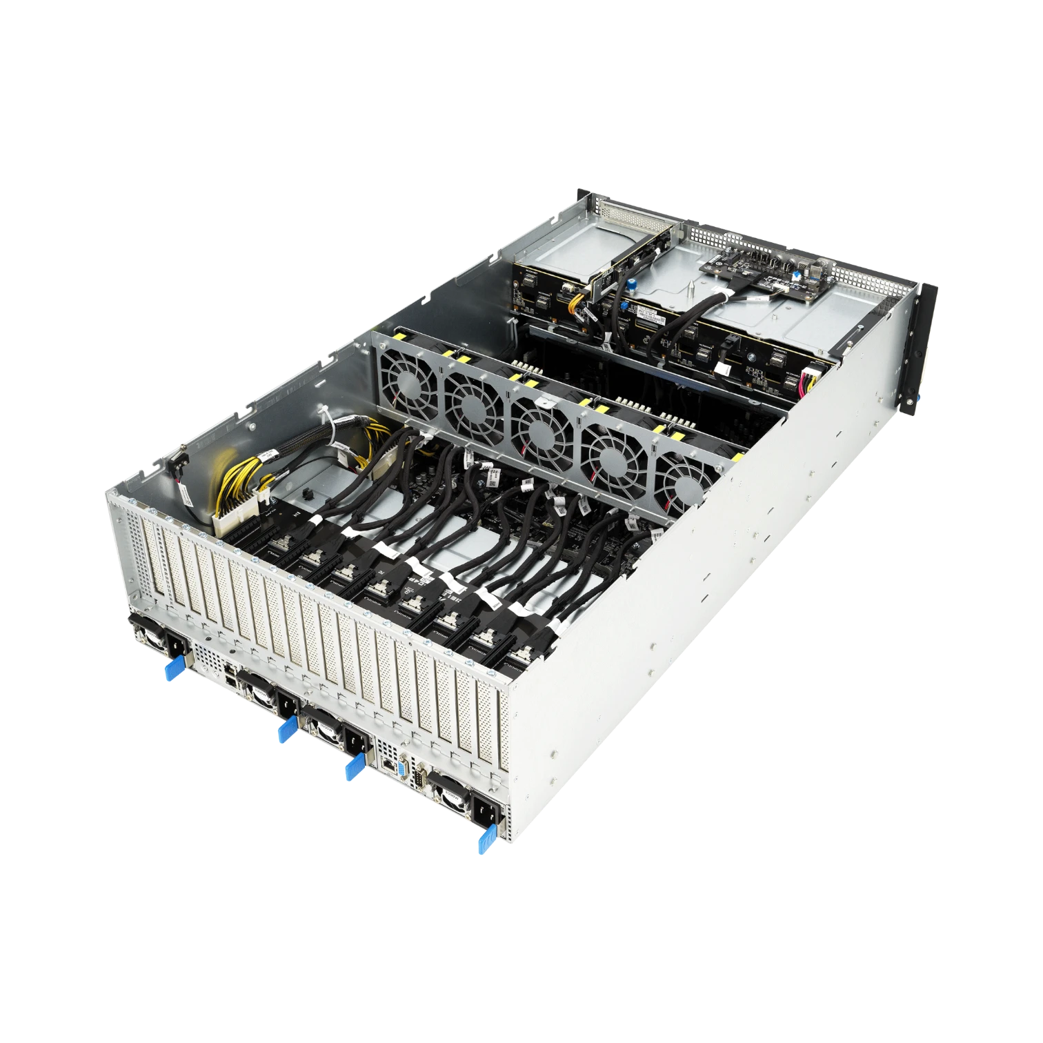 The ASUS ESC8000A-E12-26W10G is a 4U rack mount server chassis designed for organizations requiring high GPU density and fast networking. It supports two AMD EPYC 9004 series processors with up to 64 cores each and offers 24 DDR5 DIMM slots for up to 6 TB of registered memory. This server is ideal for workloads like AI training, real-time rendering, and data-intensive research that benefit from multiple GPUs working in parallel.