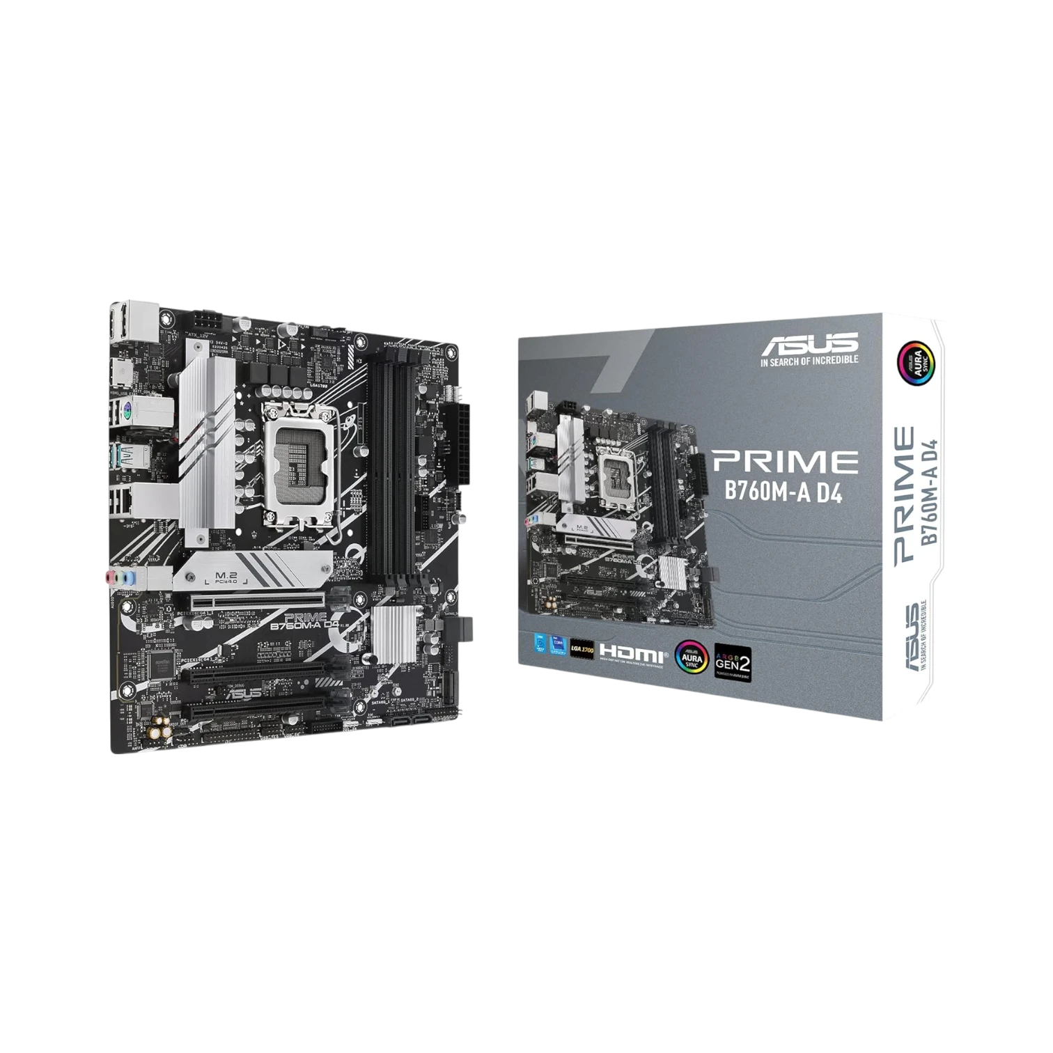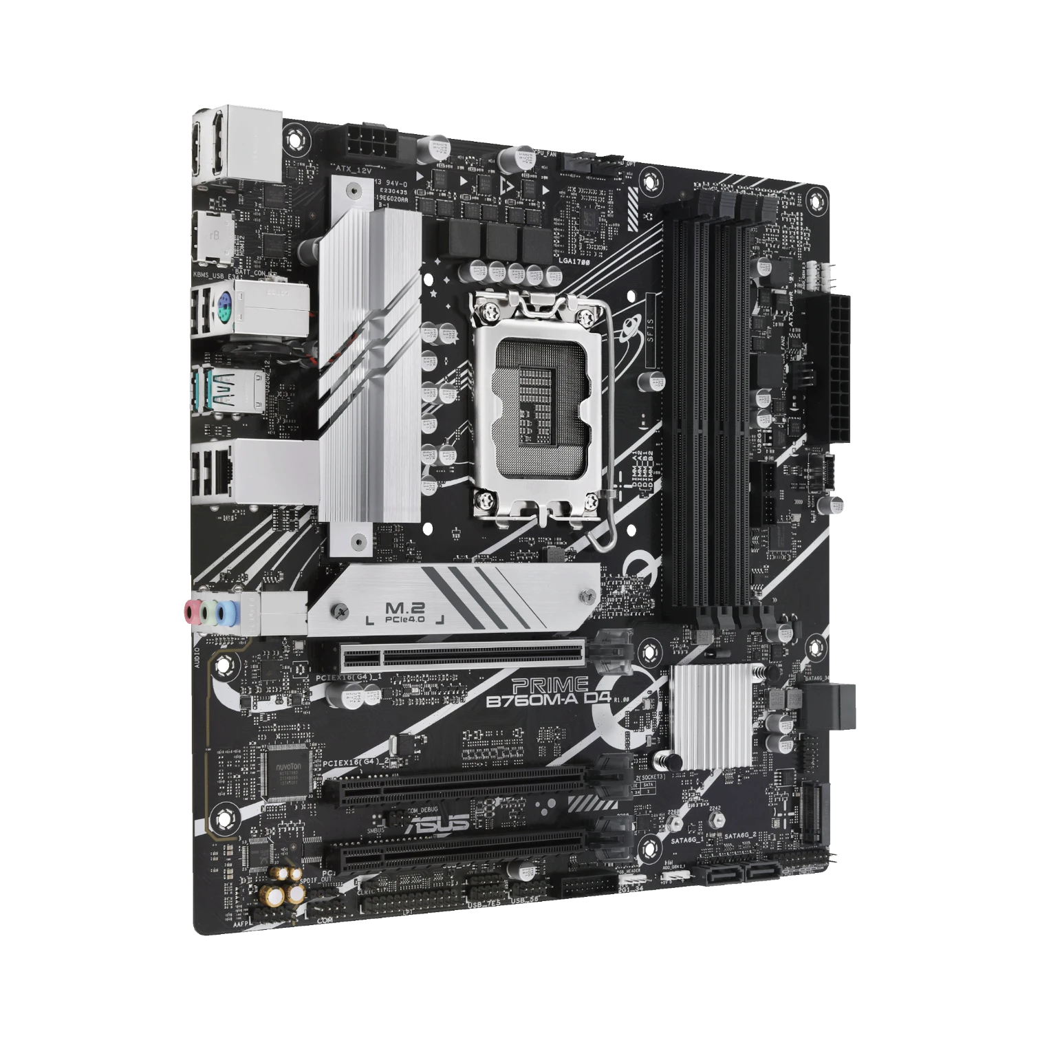 The ASUS PRIME B760M-A D4 is a Micro-ATX motherboard designed to support 12th and 13th Gen Intel processors with its LGA 1700 socket and Intel B760 chipset. It offers a compact yet versatile platform that balances performance and expandability, featuring four DDR4 DIMM slots capable of reaching 5333 MT/s when overclocked and multiple PCIe 4.0 slots for graphics and peripherals. This board is well suited for small gaming builds, office workstations, or home media centers where space is limited but functionality cannot be compromised.