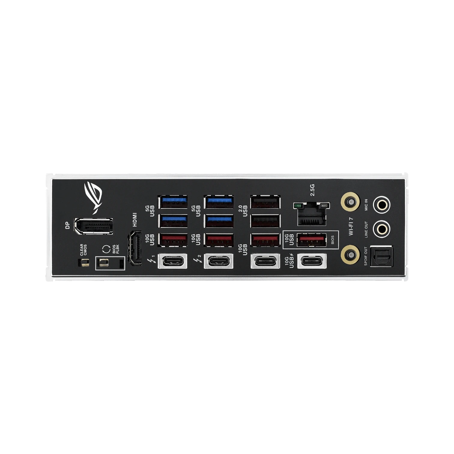 This motherboard offers a comprehensive set of ports and wireless options to support a wide range of peripherals and network environments. The dual Thunderbolt 4 ports enable fast data transfer and support for high-resolution displays, while the USB Type-C ports provide convenient charging and data connections. Integrated Wi-Fi 7 ensures the latest wireless standard for high-speed, low-latency connections, and the Intel 2.5 Gb Ethernet port delivers reliable wired networking for gaming or professional use. The PCIe 5.0 x16 slot is compatible with the newest graphics cards, making this board future-proof for upcoming hardware.