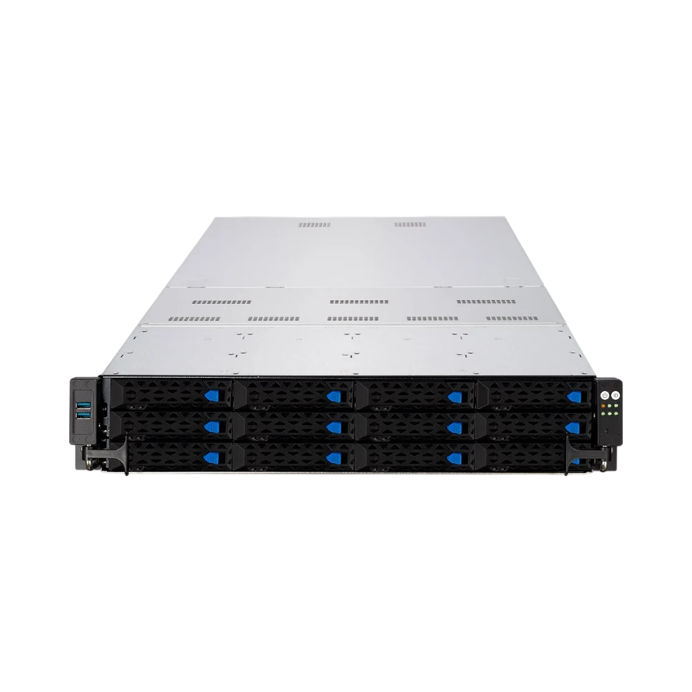 - Twelve hot-swap drive bays accept 2.5-inch or 3.5-inch NVMe, SATA, or SAS drives, enabling a mix of fast flash and high-capacity storage