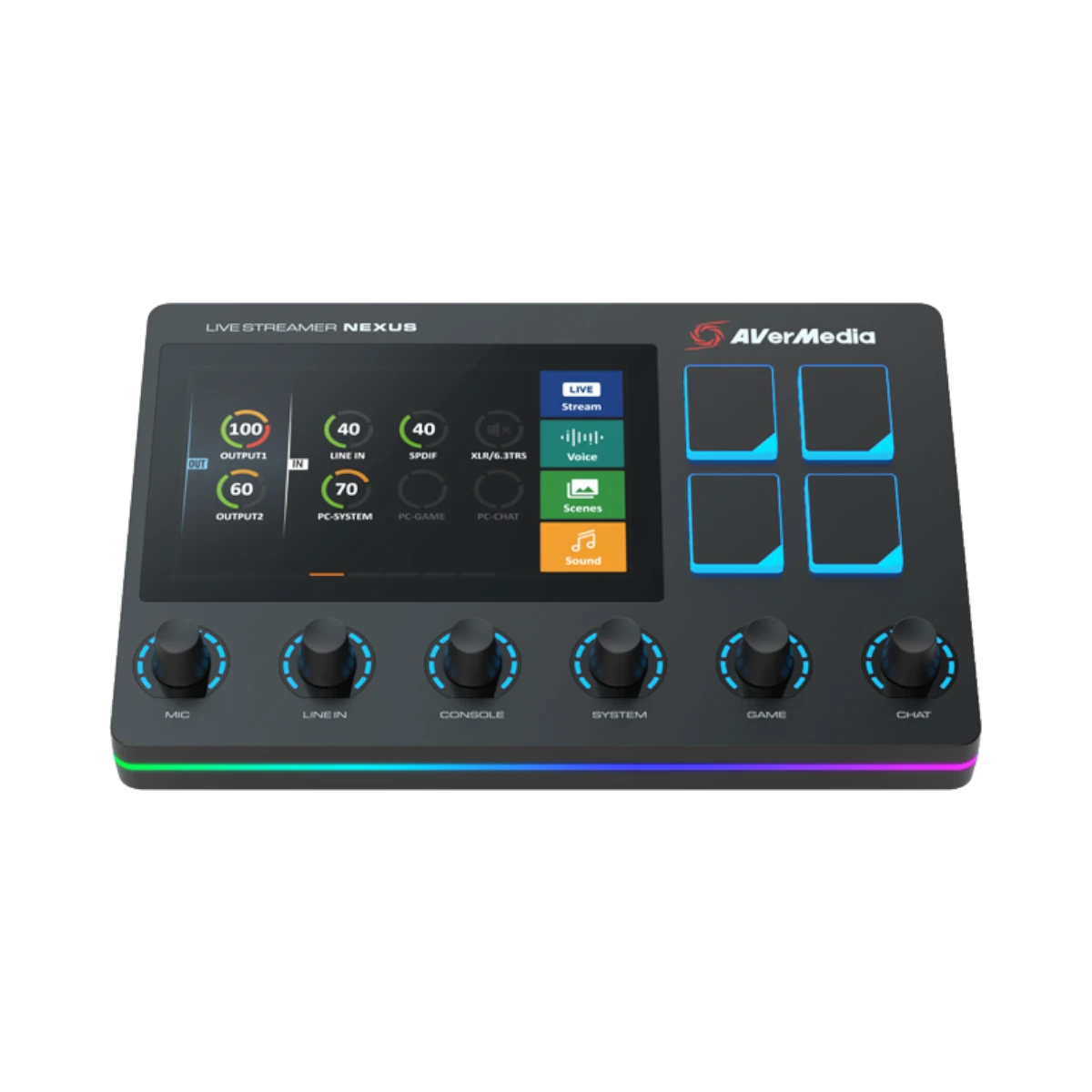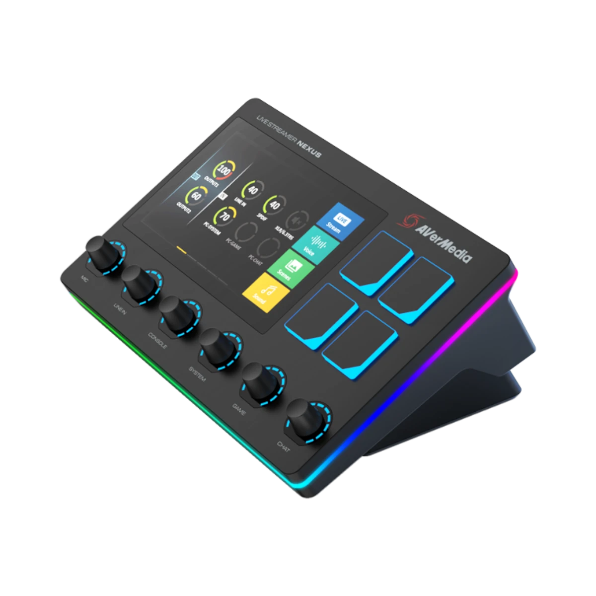 The AVerMedia AX310 is a live streaming audio mixer designed to give you precise control over every sound element in your broadcast. It features six separate audio tracks, allowing you to balance your voice, game audio, music, and alerts in real time. The dual independent audio mixes let you create one mix for your audience and a different one for yourself, ensuring both experiences are tailored to your needs. A 5-inch touch panel and four customizable buttons provide quick, intuitive control, while the Creator Central app offers drag-and-drop customization and easy microphone adjustments. This mixer is especially suited for streamers and VTubers who need flexible, hands-on audio management without complicated menus.