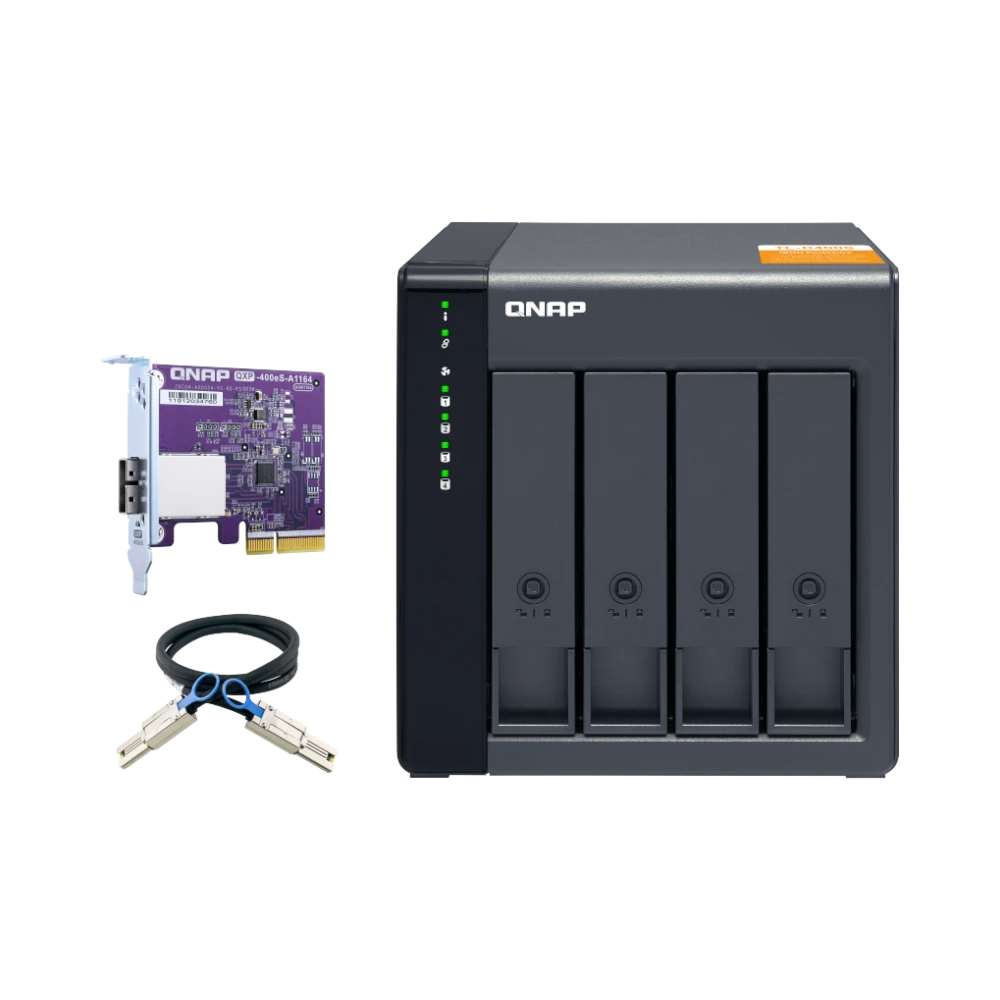 The QNAP TL-D400S-US is a 4-bay JBOD storage enclosure designed to expand storage capacity for QNAP NAS devices, Windows workstations, and Ubuntu servers. It supports both 2.5-inch and 3.5-inch SATA drives running at speeds up to 6 Gb/s, making it suitable for demanding data transfer tasks such as video editing, virtual machine backups, and other data-intensive applications. The enclosure connects via high-speed SFF-8088 or SFF-8644 cables to an included QXP PCIe card, ensuring low latency and high bandwidth for efficient data handling.