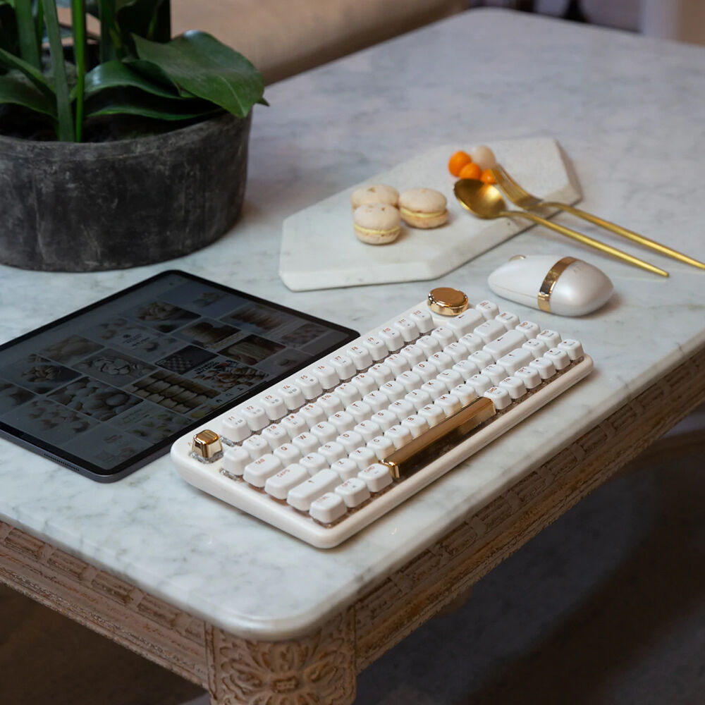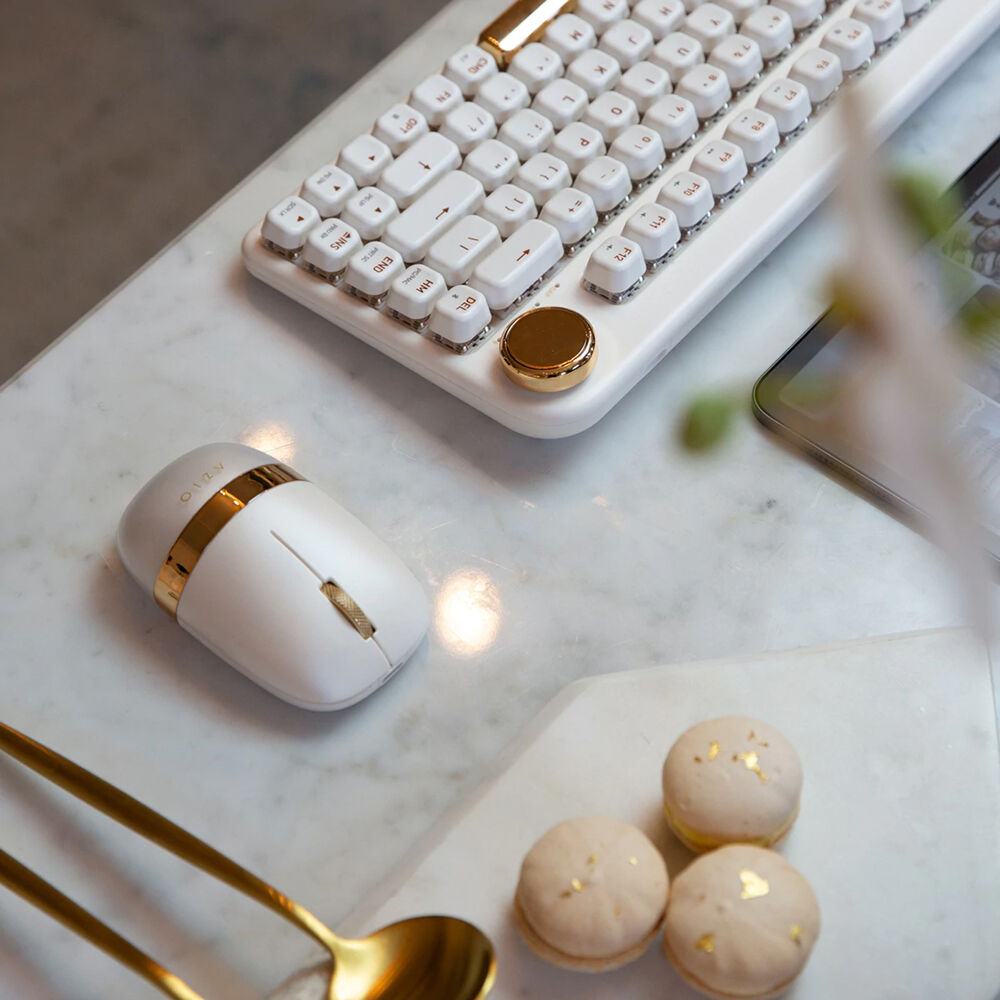 - Elegant white blossom color with metallic gold accents and a soft-touch translucent body that enhances any workspace aesthetic