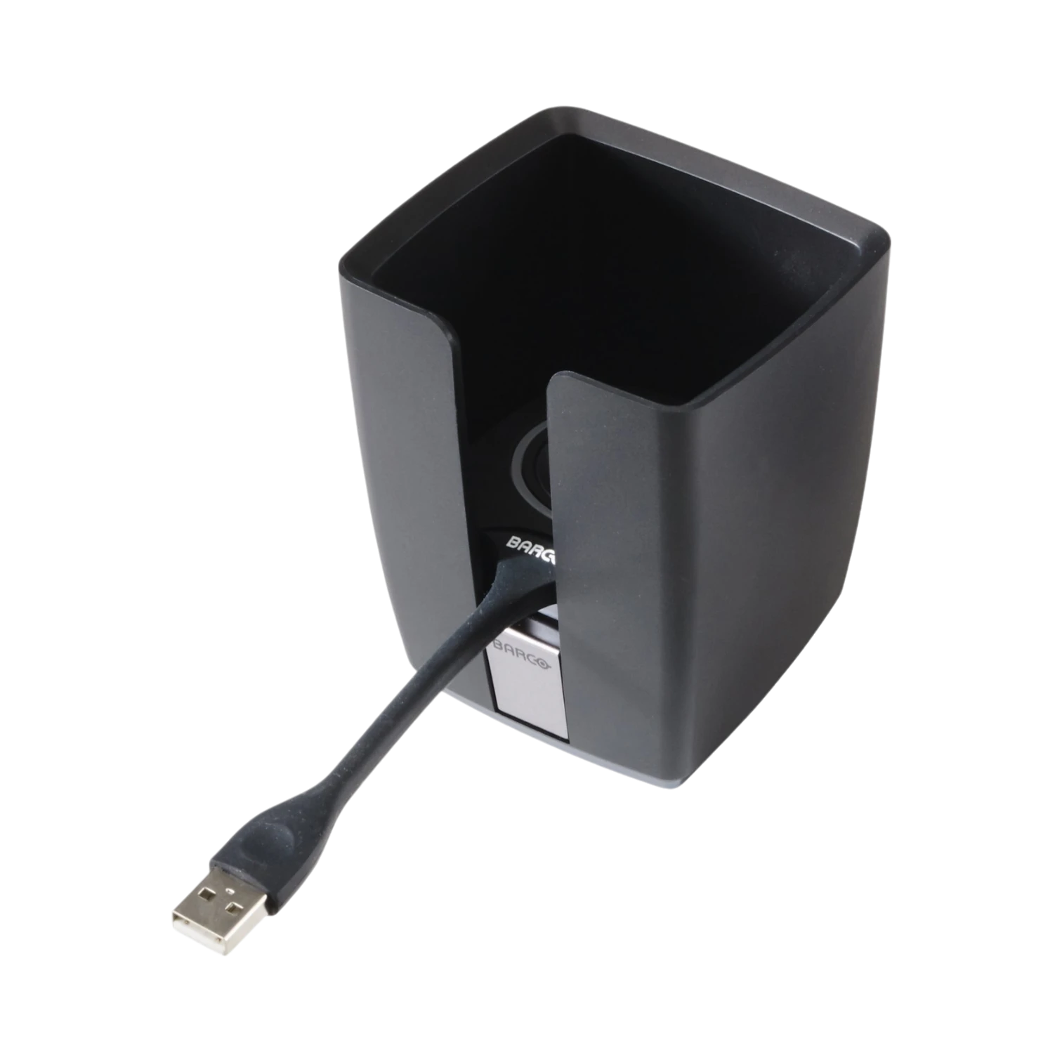The Barco R9861500T01 is a specialized tray designed to hold up to four Barco ClickShare buttons, providing a dedicated and organized spot for these wireless content sharing devices. Its compact 3.2-inch diameter footprint and 5.2-inch height make it a practical addition to any meeting space, keeping buttons upright and easily accessible without taking up much room on the table.