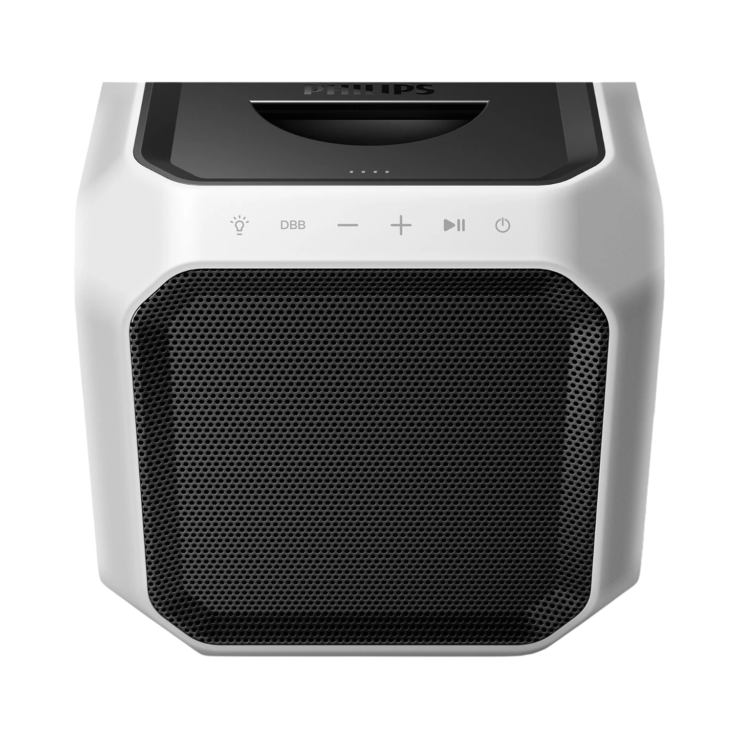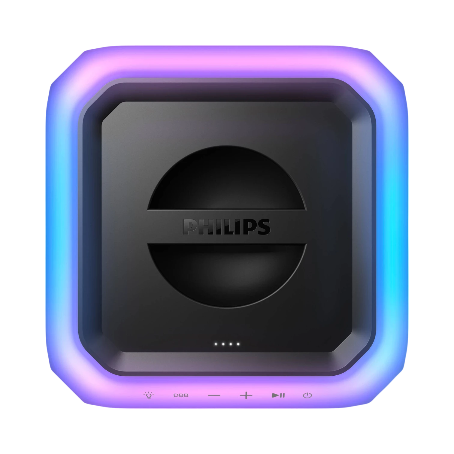 The Philips TAX7207/37 is a wireless party speaker designed to deliver powerful 2.1-channel sound and vibrant lighting effects for social gatherings. It produces up to 80 W RMS of audio through two 2-inch tweeters, a 6.5-inch woofer, and passive radiators that enhance bass performance. This speaker supports multiple input options including Bluetooth 5.0, USB-A, and a 3.5 mm AUX port, making it versatile for various music sources. Its built-in 2600 mAh battery offers around 12 hours of playback, making it suitable for extended events without needing frequent recharging.