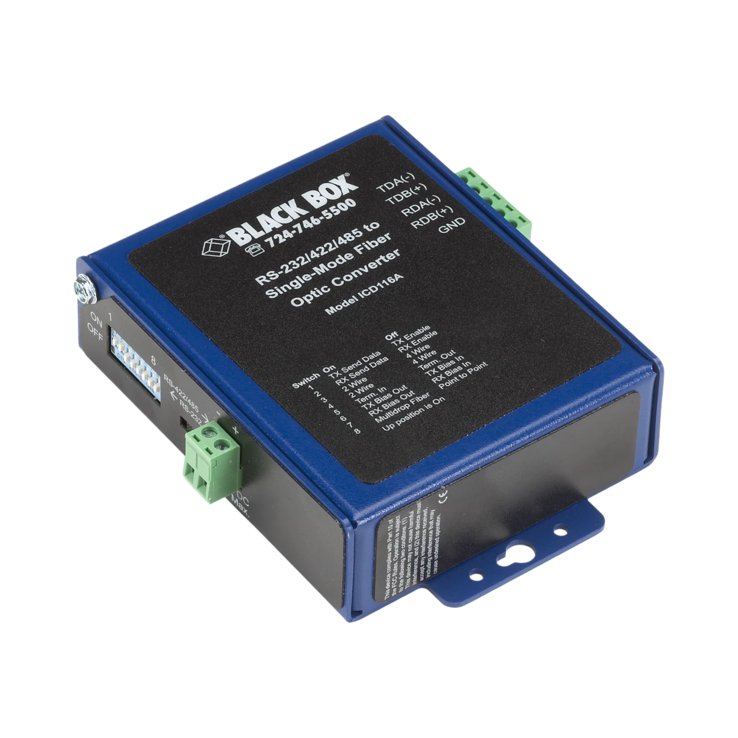 The Black Box ICD116A is a fiber extender designed to convert asynchronous RS-232, RS-422, or RS-485 serial signals for transmission over singlemode fiber optic cables. It enables reliable data communication over distances up to 15 kilometers at speeds reaching 115.2 kbps, making it an effective solution for connecting control rooms with remote sensors, PLCs, or terminals in industrial, utility, or defense environments. Its robust design isolates connected equipment from electrical noise and ground loops, ensuring stable operation in challenging conditions.