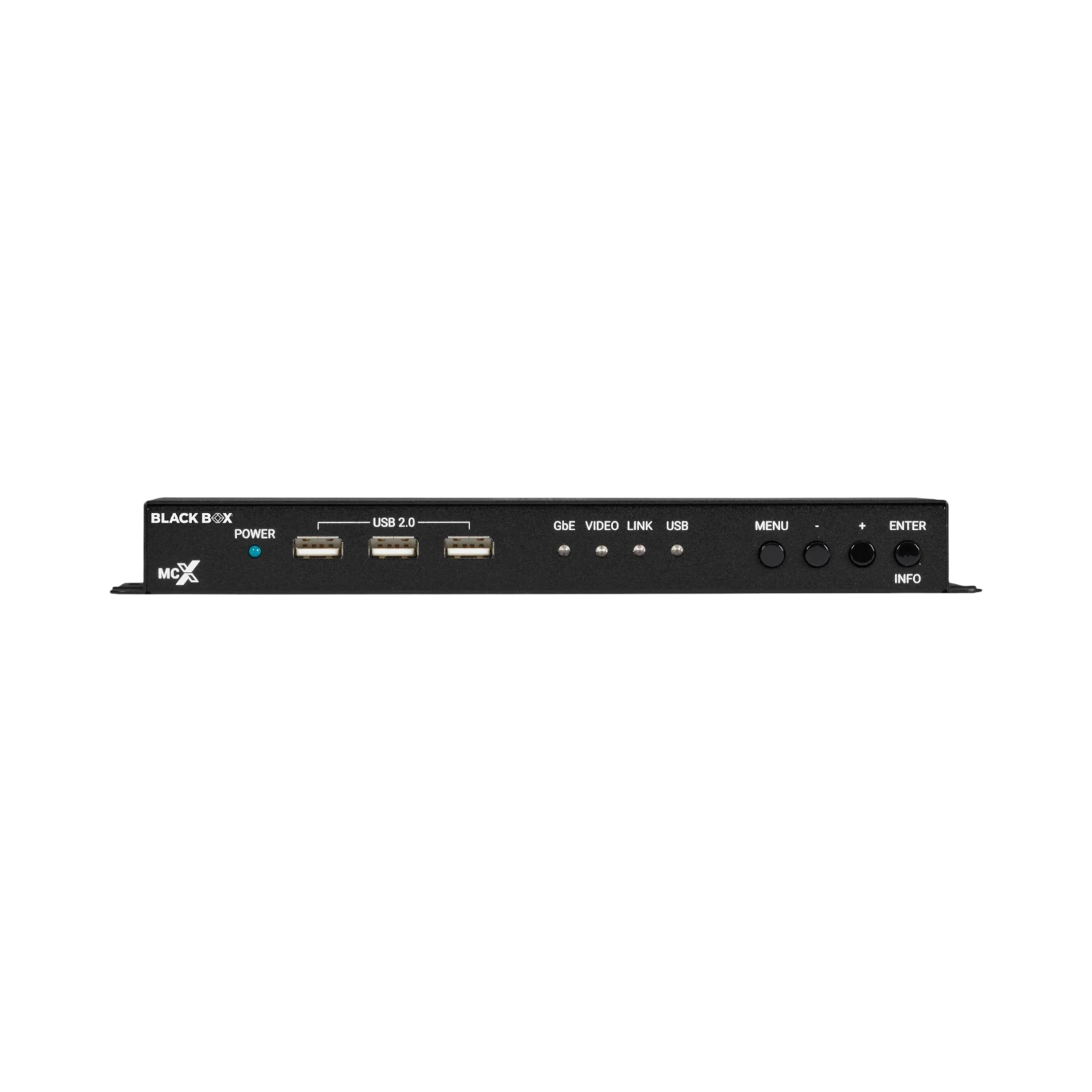 This decoder integrates video, audio, USB 2.0, and RS-232 control data into a single stream, simplifying cabling and rack organization. Its front-panel navigation and on-screen display make local configuration straightforward, while compatibility with the MCX Gen2 Controller enables centralized source switching, preset management, and system monitoring. A local HDMI output allows technicians to verify signals on-site without additional equipment.