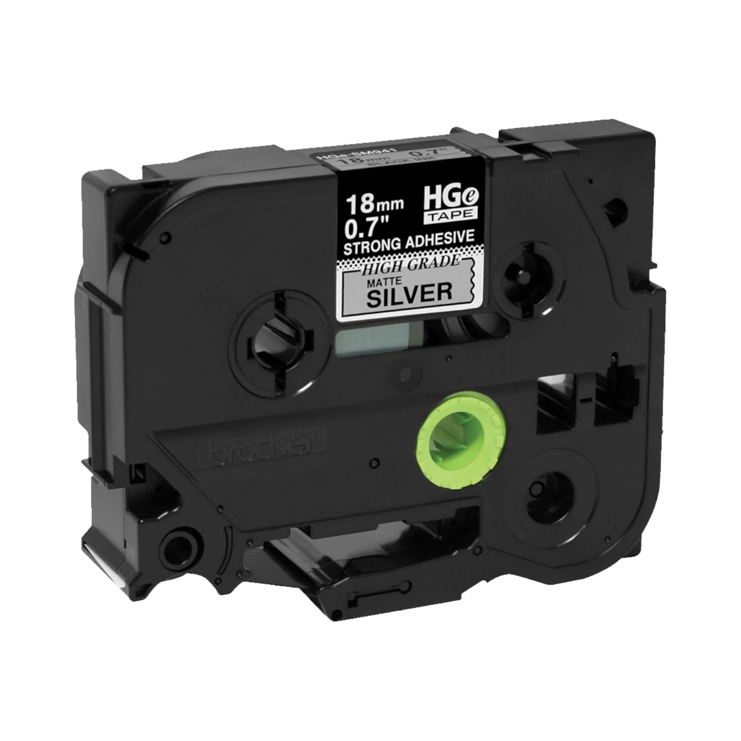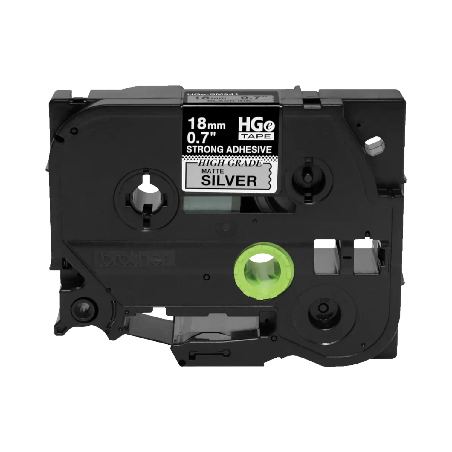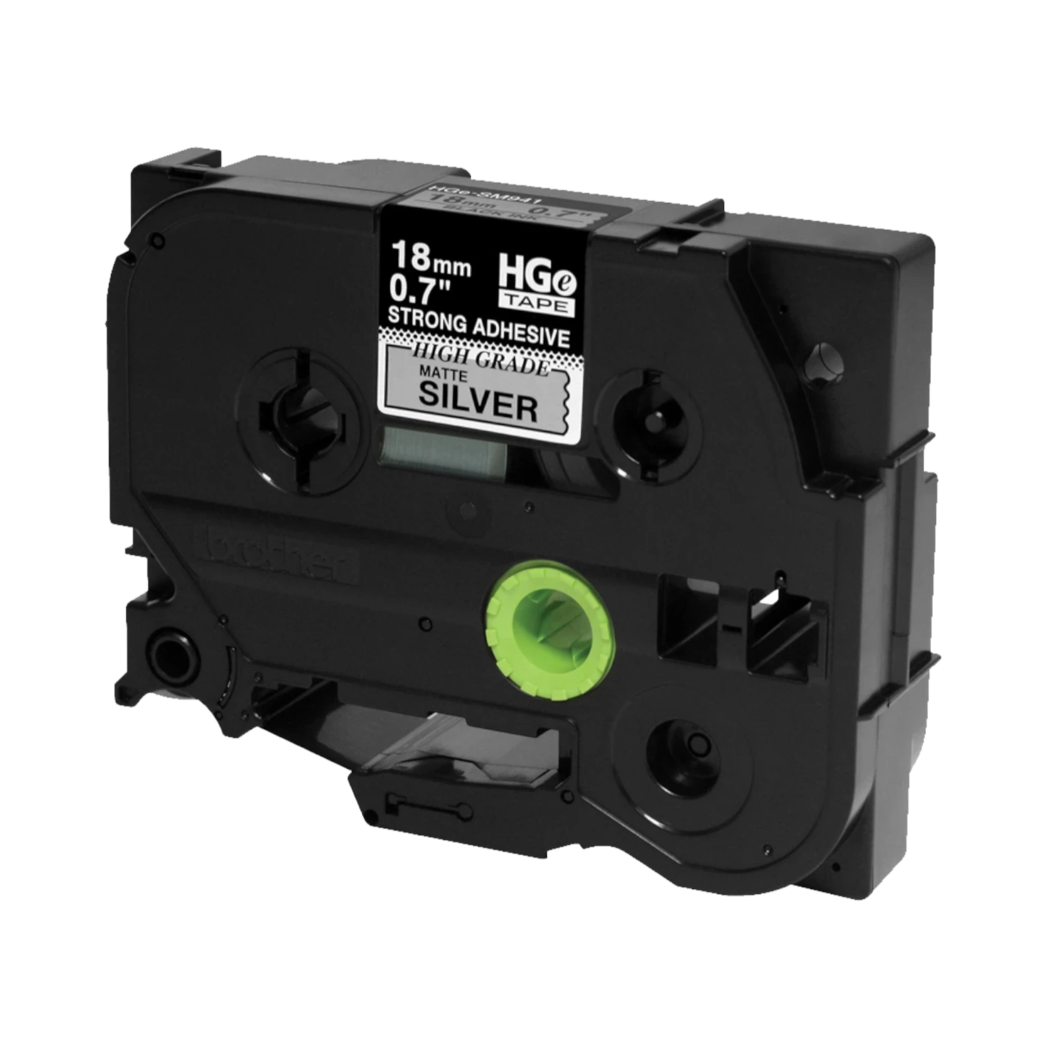 The Brother HGES9415PK is an industrial grade labeling tape designed to produce clear and professional labels in challenging environments. Measuring 18 mm wide and 8 m long per roll, it features black text on a matte silver background that reduces glare and remains easy to read under bright lighting. Its extra strength adhesive ensures reliable adhesion on textured, uneven, or slippery surfaces, making it suitable for a variety of demanding applications.