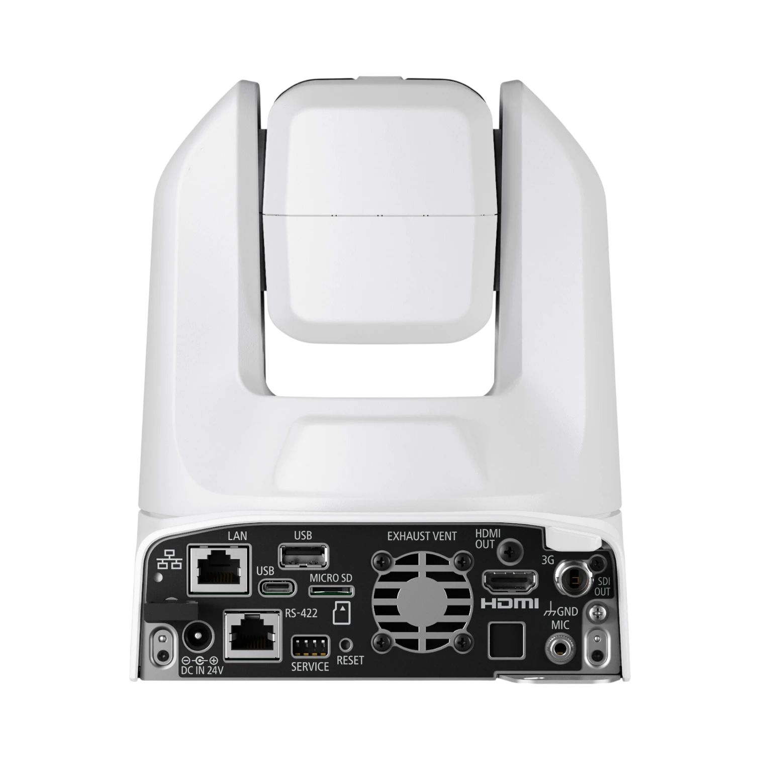 Its connectivity options include HDMI, 3G-SDI, USB-C, and IP streaming with support for NDI|HX, RTMP, and SRT protocols. Power over Ethernet Plus (PoE+) simplifies installation by combining power, control, and video transmission into a single cable. The camera’s smooth pan and tilt motors allow precise movement, while multiple scene modes optimize image quality in various lighting conditions. The titanium white finish and compact design help it blend discreetly into light-colored environments.