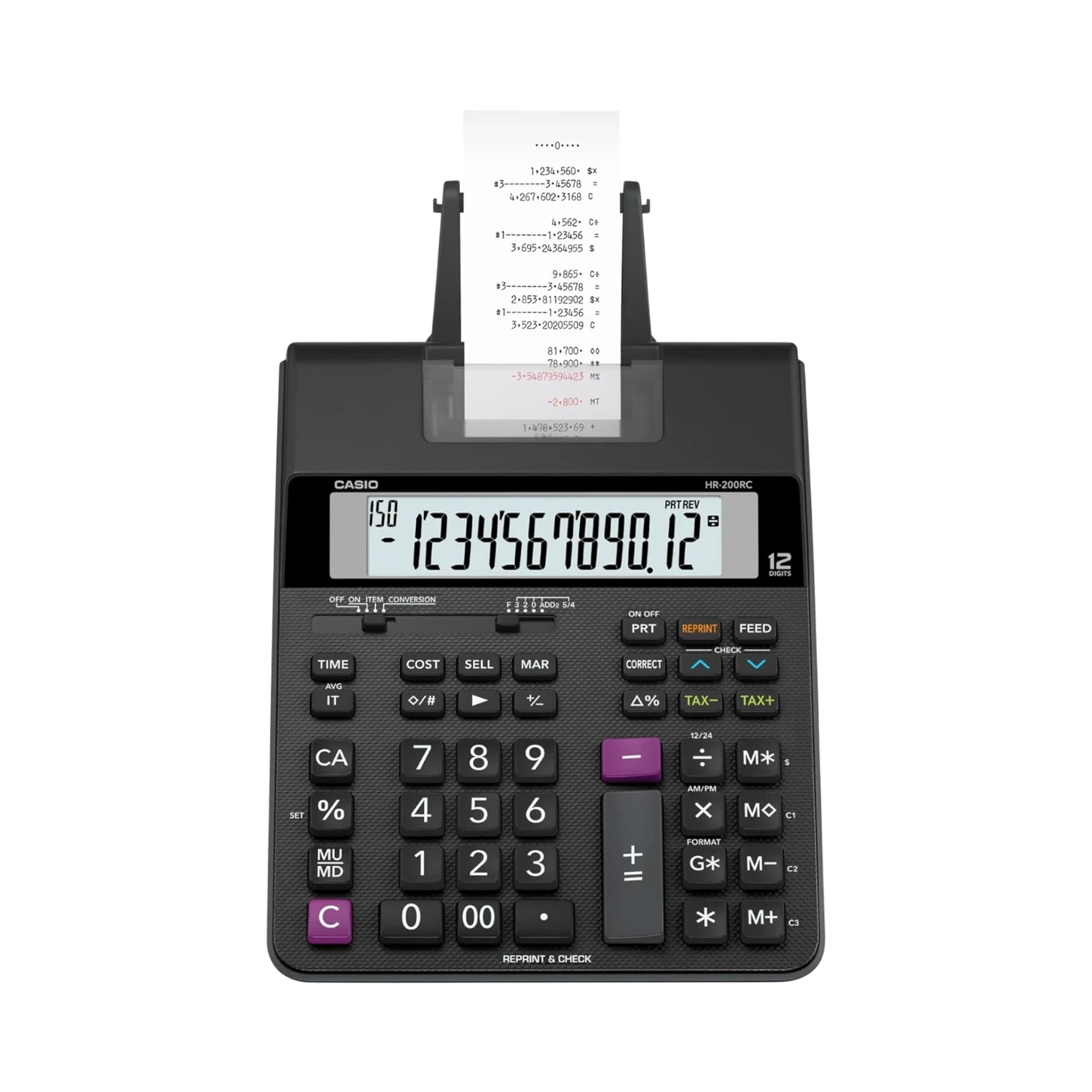 The Casio HR-200RC is a mini desktop printing calculator designed to provide quick and reliable hard-copy records alongside clear on-screen totals. It features a large 12-digit display that makes it easy to verify long numbers before printing. With a printing speed of 2.0 lines per second in black and red, it clearly distinguishes subtotals, totals, and negative values, making it well suited for retail counters, small business offices, and home workstations where daily calculations and receipt-style printouts are essential.