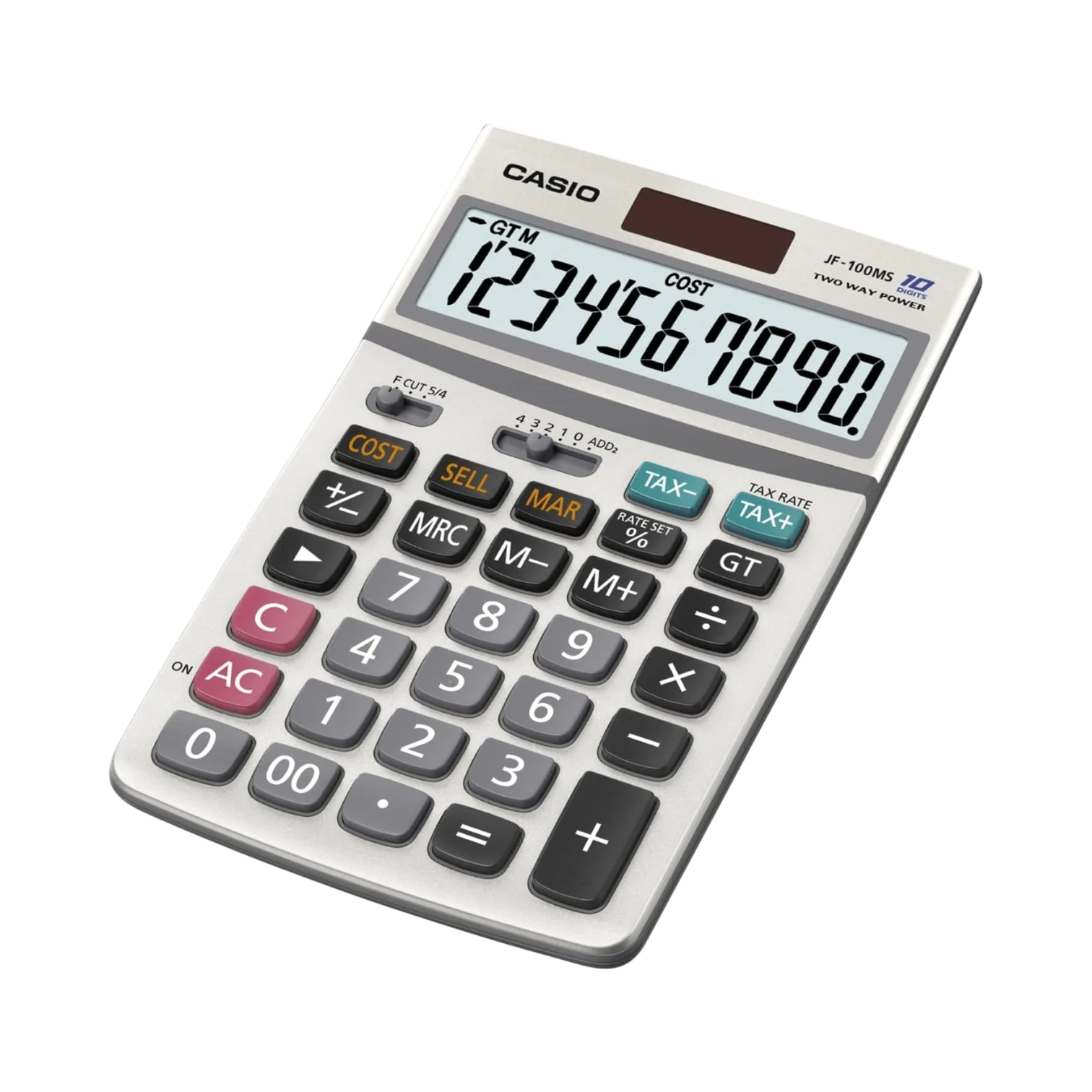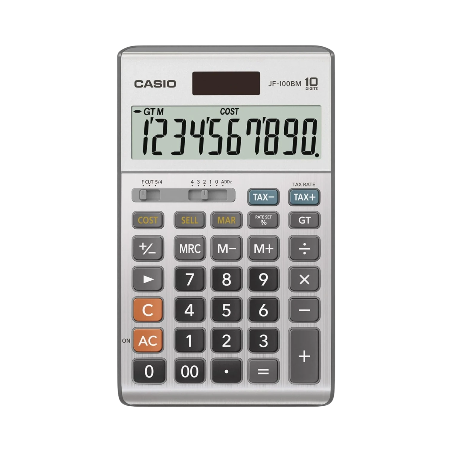 The Casio JF-100BM is a standard function calculator designed to handle everyday business math with ease. It features a large 10-digit LCD display that makes numbers easy to read at a glance, helping you work efficiently without errors. Powered primarily by solar energy with a battery backup, this calculator ensures continuous operation even in low light conditions, making it a dependable tool for office, retail, or study environments.
