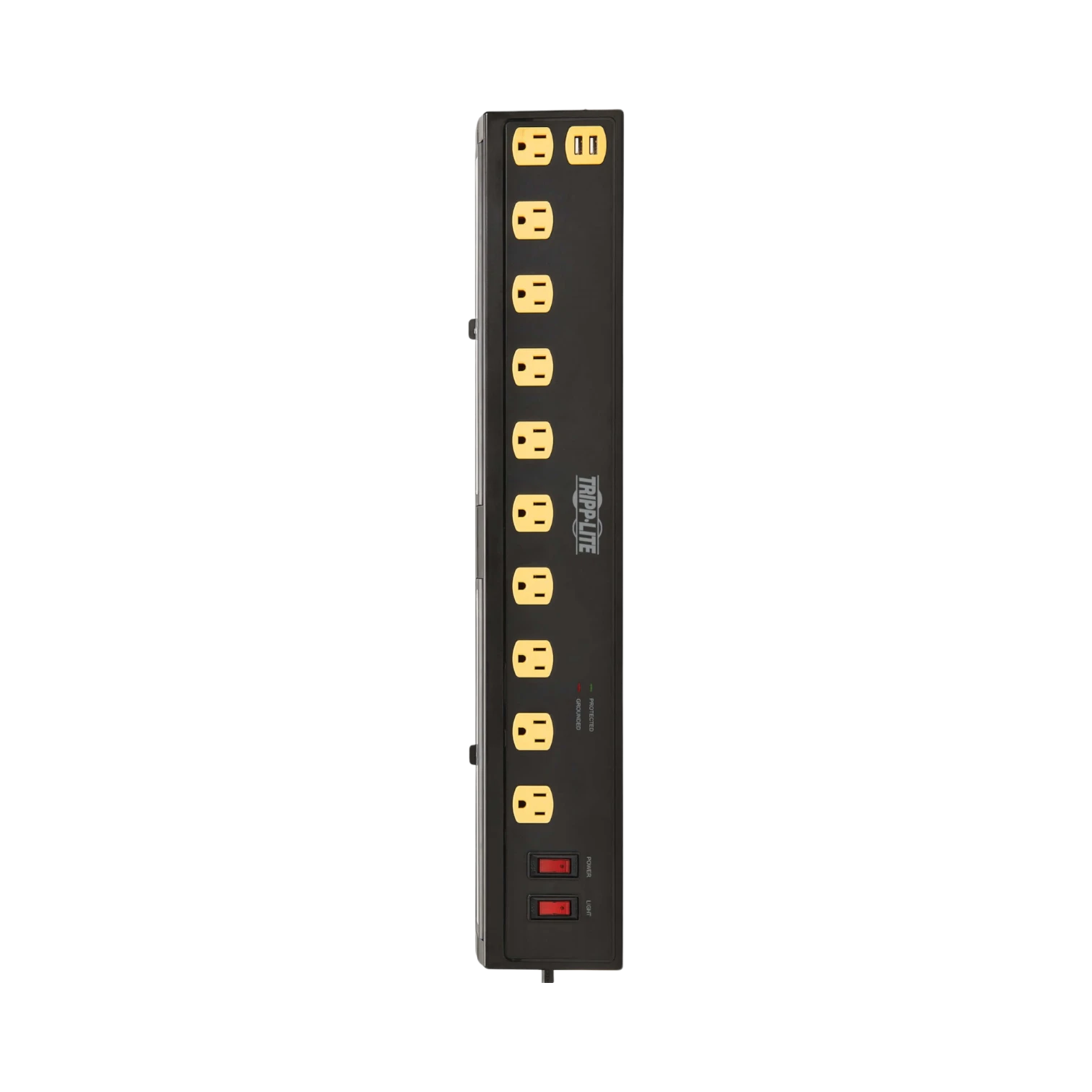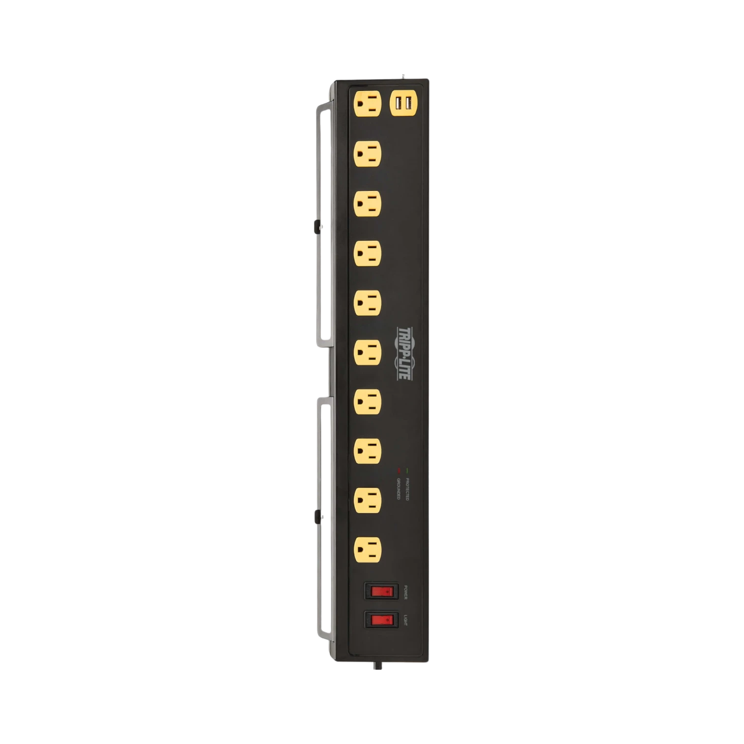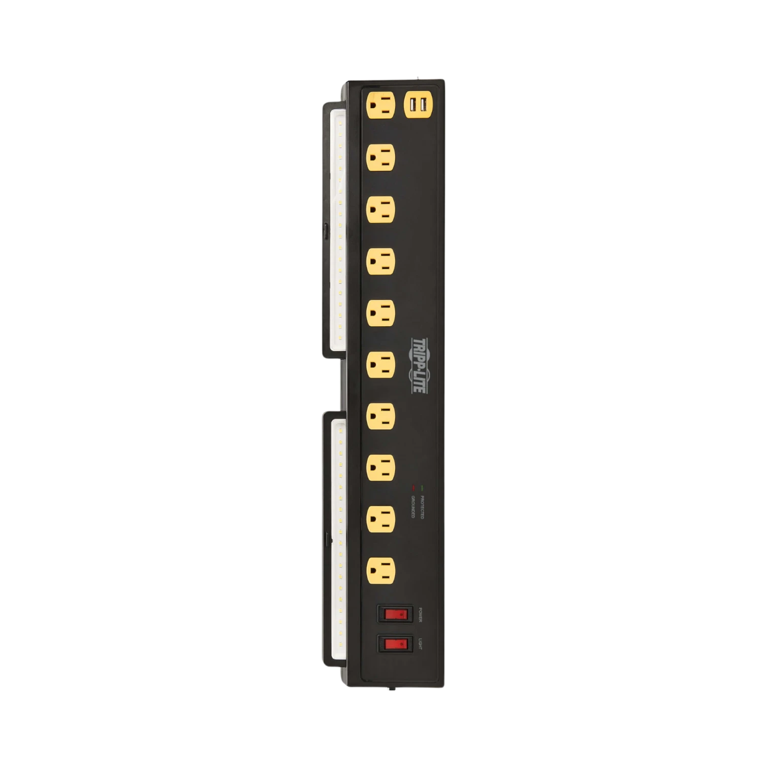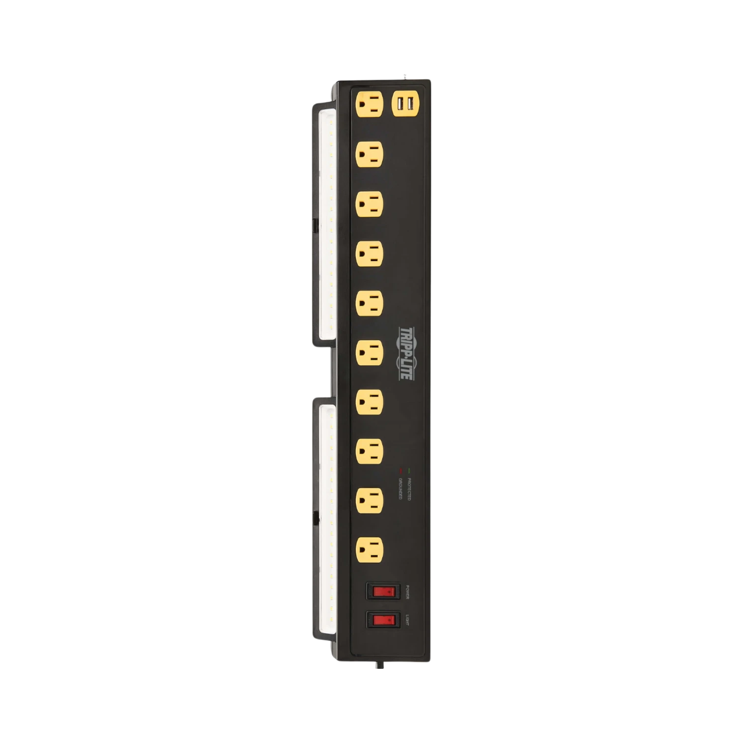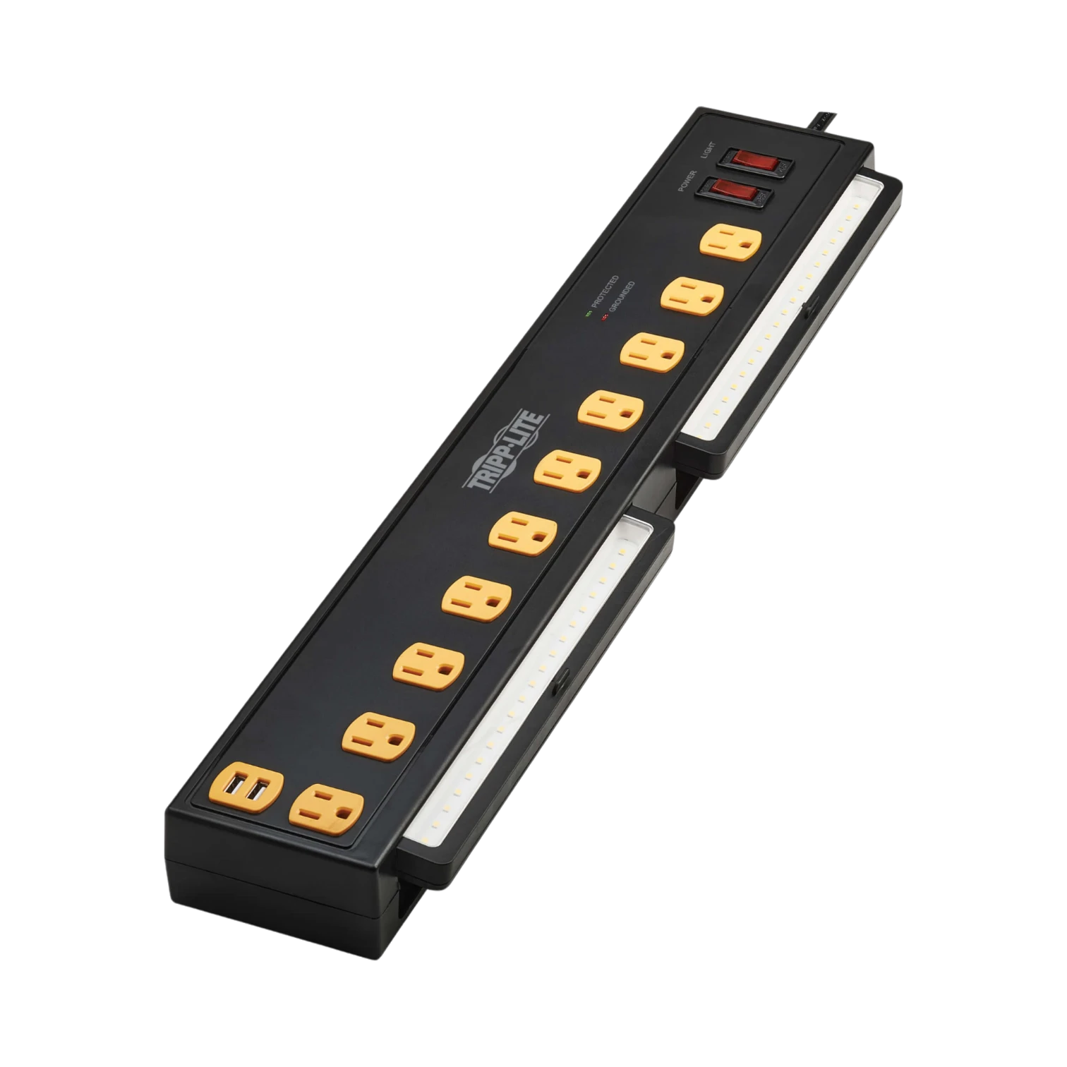 The Tripp Lite TLP1006USB is a surge protector designed to provide reliable power distribution and device protection in environments where multiple electronics are used simultaneously. It features ten AC outlets and two USB-A charging ports, making it suitable for home offices, classrooms, workshops, or any space requiring organized and safe power access. With a surge absorption rating of 1350 joules, it safeguards connected equipment from power spikes and line noise, while integrated swivel lights offer bright task illumination of 1000 lumens each.