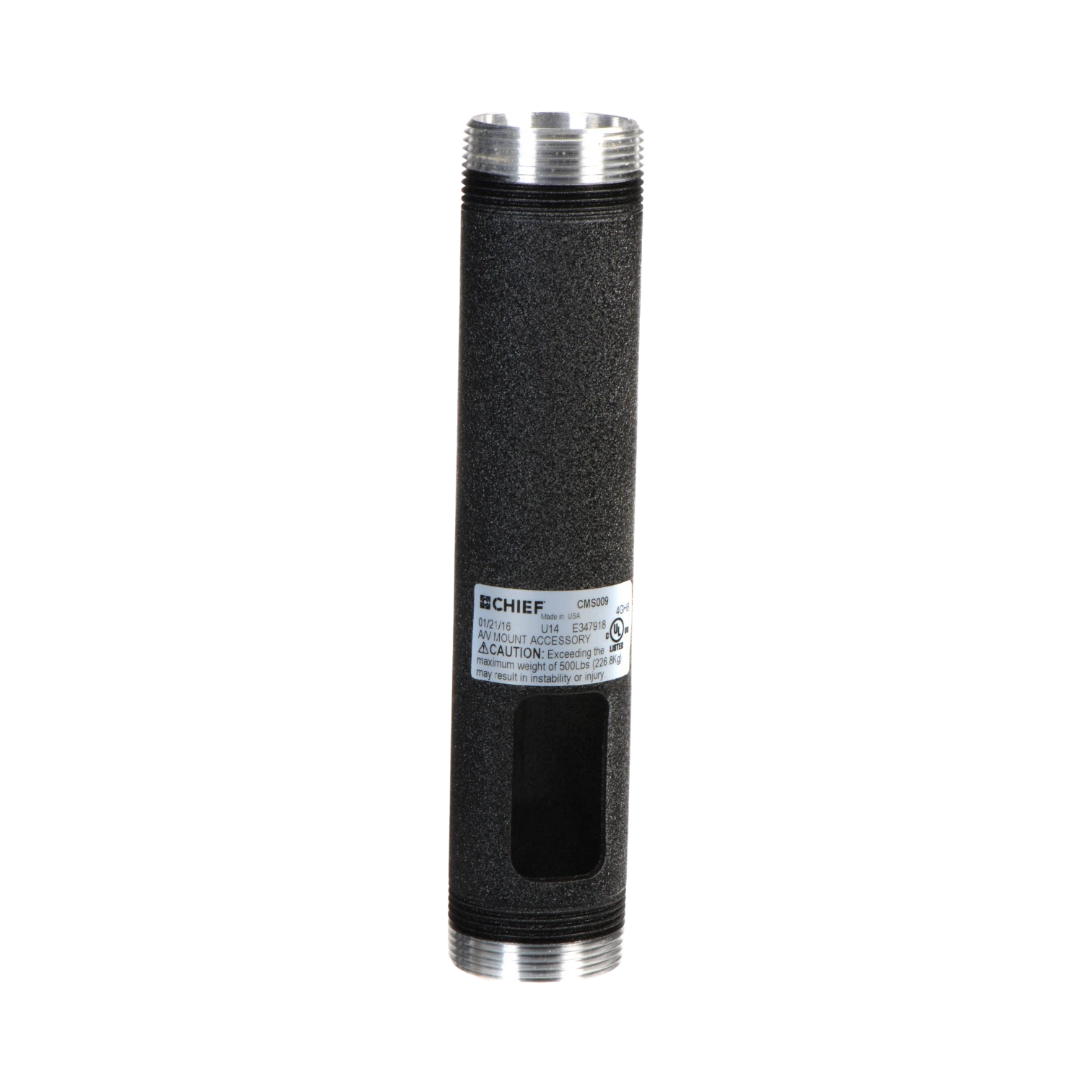 Its design includes standard 1.5-inch NPT threads on both ends for quick and secure attachment to any Chief ceiling plate or accessory, ensuring seamless integration with existing mounting systems. The hollow interior allows cables to be routed discreetly through the column, exiting via a subtle port to keep wiring hidden and maintain a clean, professional appearance. The black finish complements most AV hardware and ceiling spaces, focusing attention on the display rather than the mounting equipment. Additionally, the CMS009 meets TAA compliance, making it suitable for government and regulated environments.