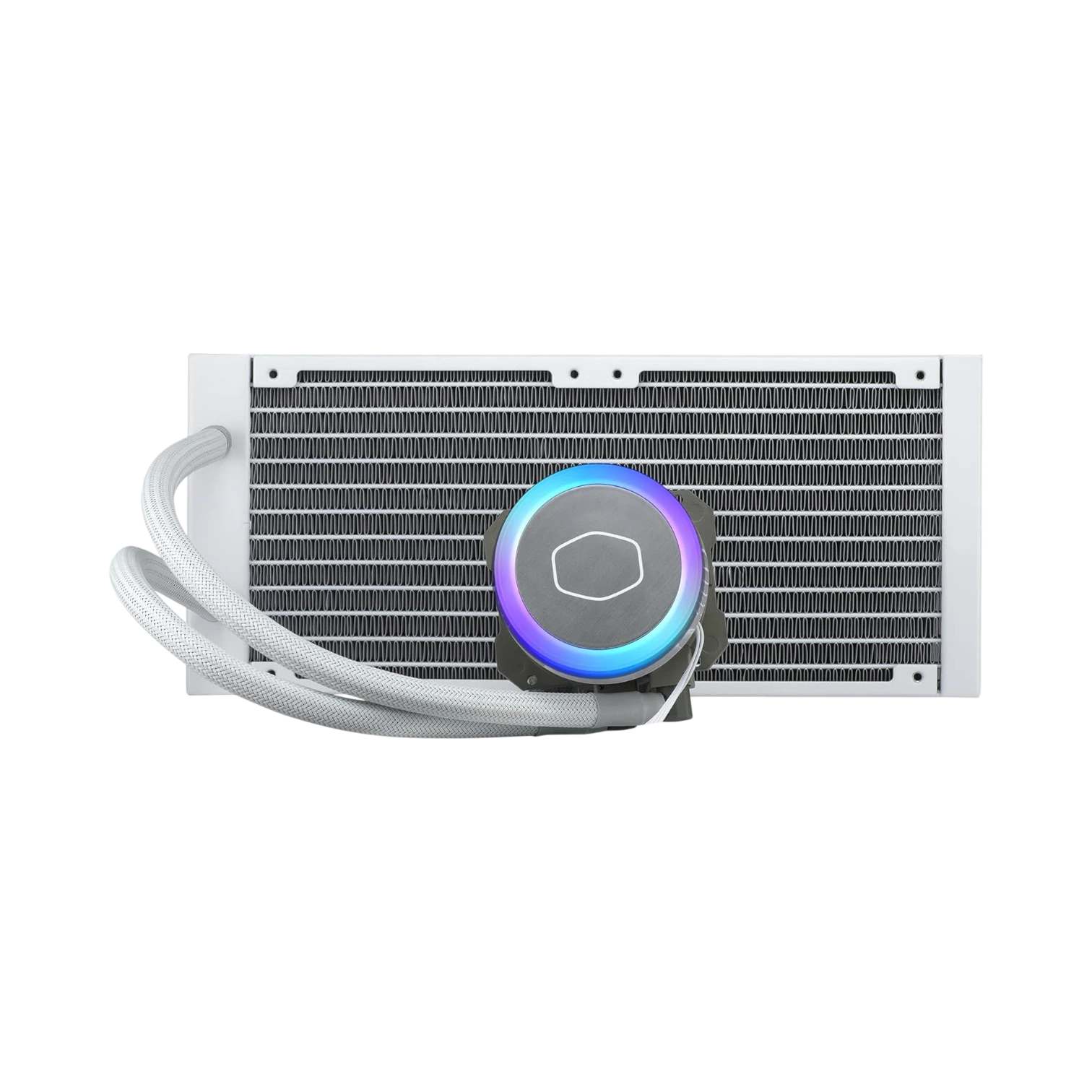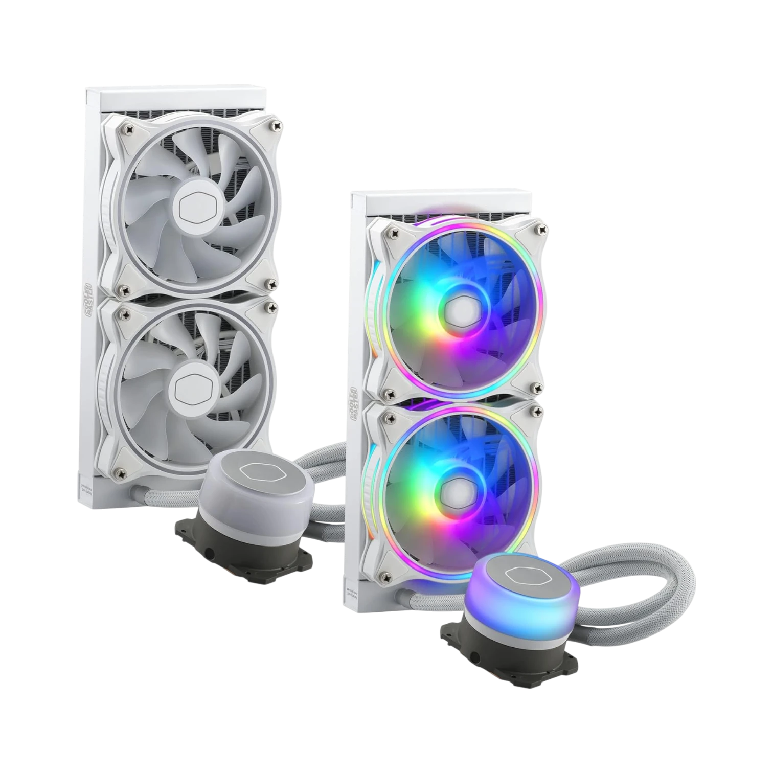 The Cooler Master MLX-D24M-A18PW-R1 is a closed-loop liquid CPU cooler designed to provide efficient thermal management for modern processors. Featuring a 240 mm radiator and two MF120 Halo PWM fans, it balances cooling performance with quiet operation at around 30 dB. Its crisp white finish and addressable RGB lighting on both the pump head and fans add a visually appealing element to any build, especially those with a white-themed aesthetic.
