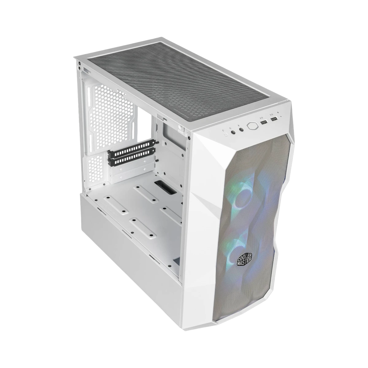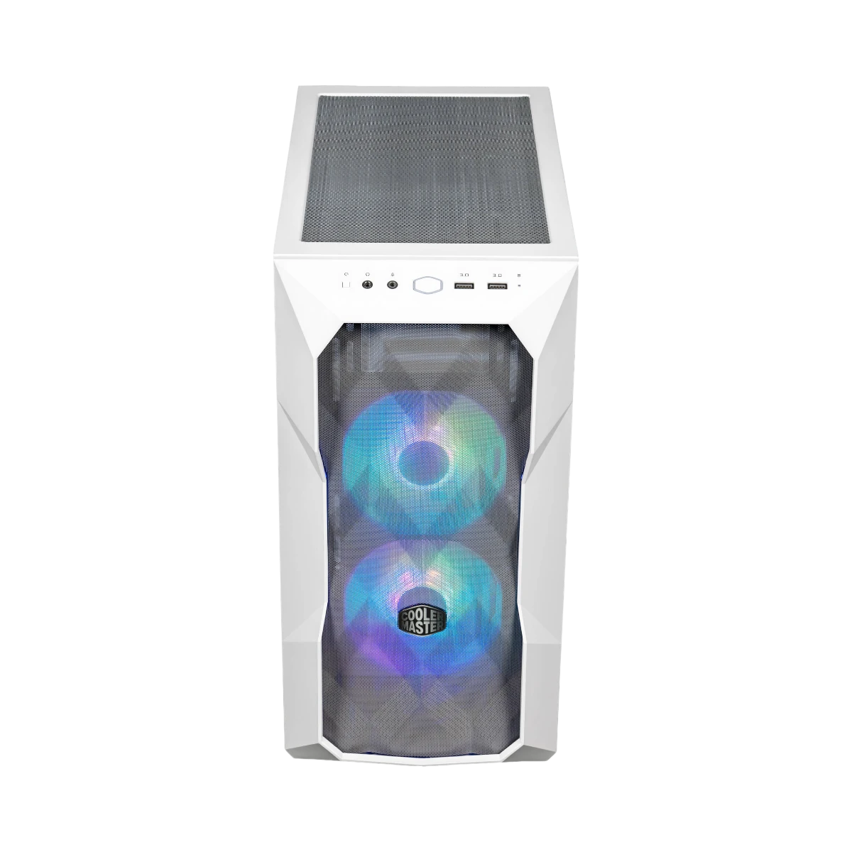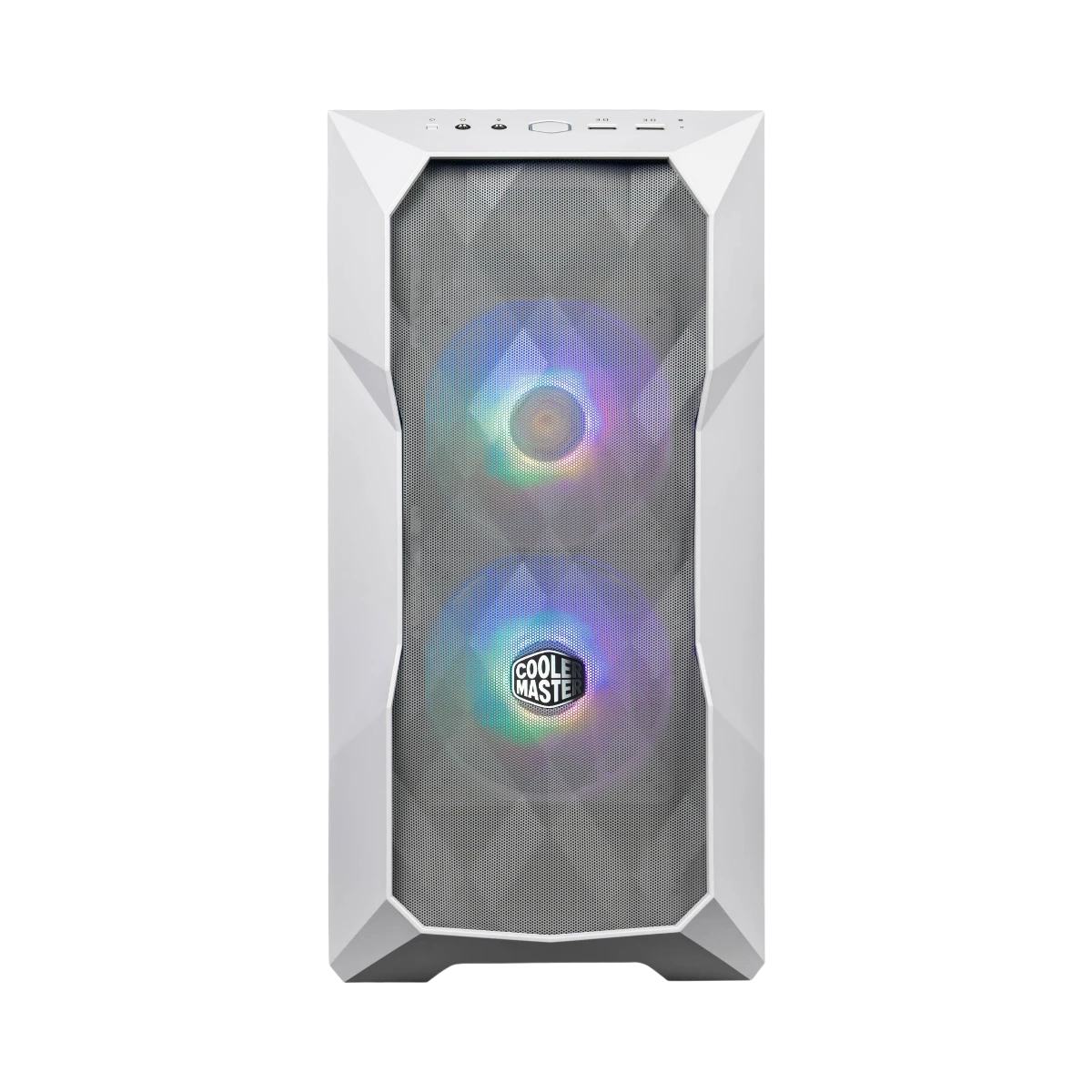 The Cooler Master TD300-WGNN-S00 is a Micro-ATX tower case designed to deliver strong system performance while maintaining a compact footprint. Its white finish and tempered glass side panel provide a clean and modern look, making it suitable for gamers, content creators, and anyone needing a powerful build in a smaller space. The case features two preinstalled ARGB SickleFlow fans and a FineMesh front panel that ensures excellent airflow and dust filtration, keeping components cool and protected.