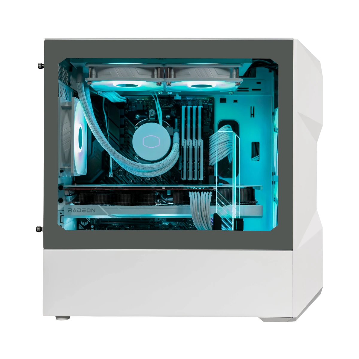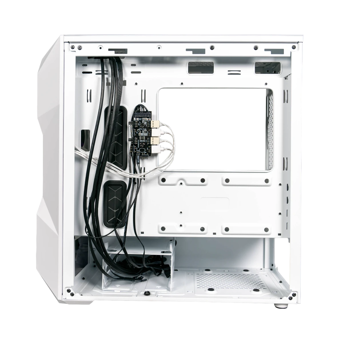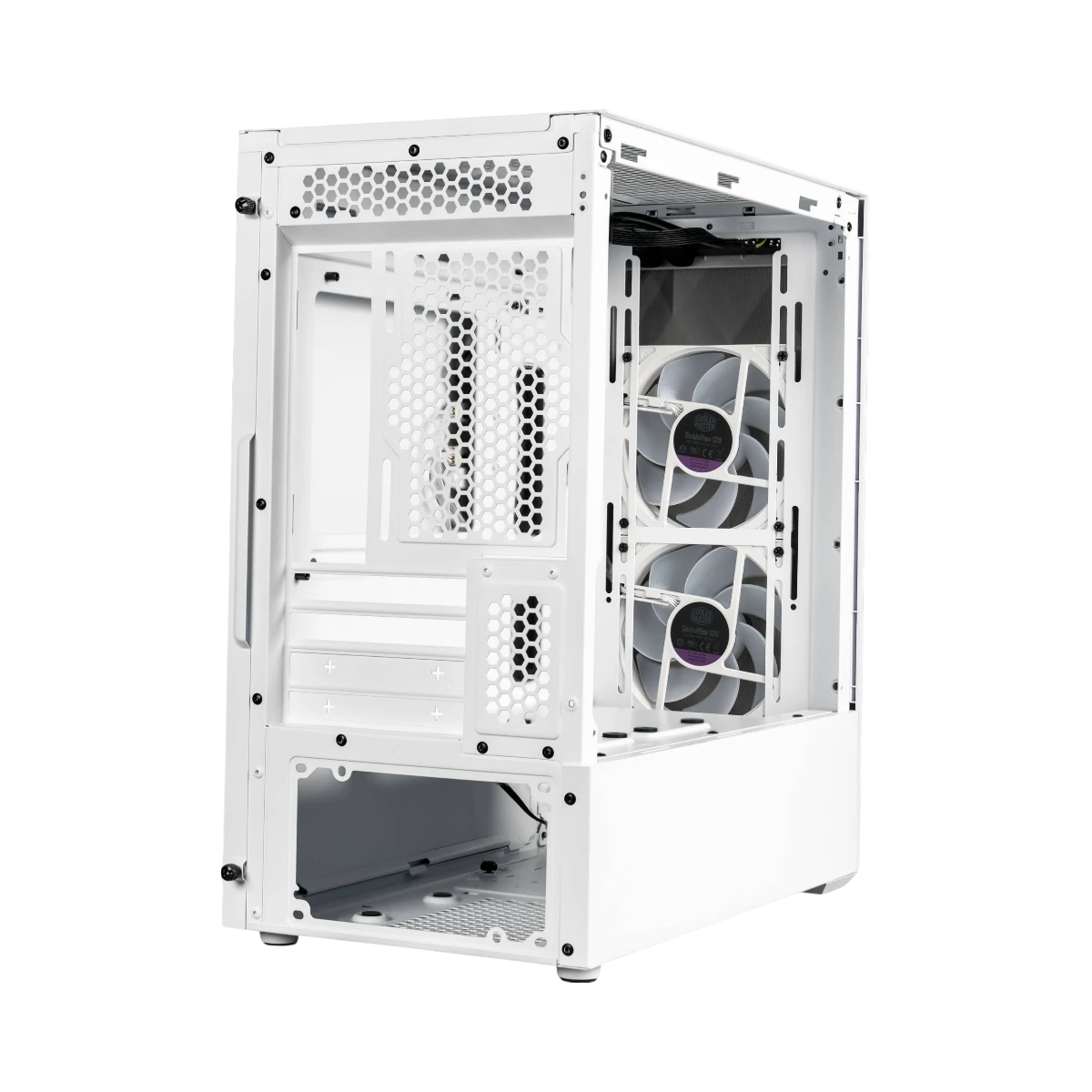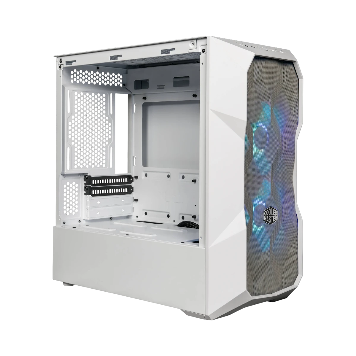 The Cooler Master TD300-WGNN-S00 is a Micro-ATX tower case designed to deliver strong system performance while maintaining a compact footprint. Its white finish and tempered glass side panel provide a clean and modern look, making it suitable for gamers, content creators, and anyone needing a powerful build in a smaller space. The case features two preinstalled ARGB SickleFlow fans and a FineMesh front panel that ensures excellent airflow and dust filtration, keeping components cool and protected.
