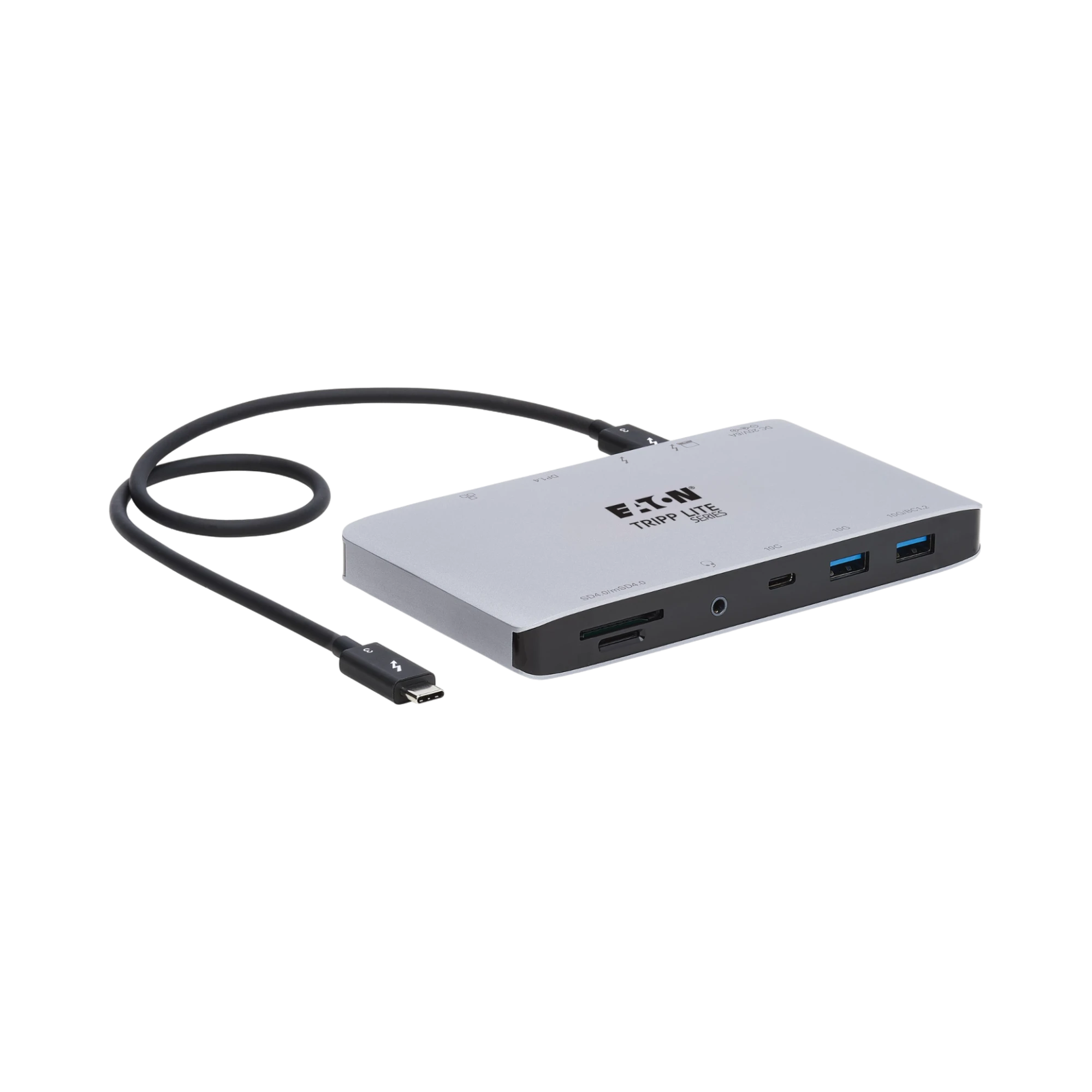 The Tripp Lite MTB3-DOCK-03INT is a Thunderbolt 3 docking station designed to transform a MacBook Pro or Windows laptop into a full desktop workstation using a single cable. It supports dual DisplayPort monitors with resolutions up to 8K or 4K, delivers up to 60 watts of power to the host device, and enables fast data transfer speeds of up to 40 Gbps. This dock simplifies connectivity by consolidating multiple peripherals and network access into one compact unit, making it ideal for professionals who need efficient multitasking and a clean workspace.
