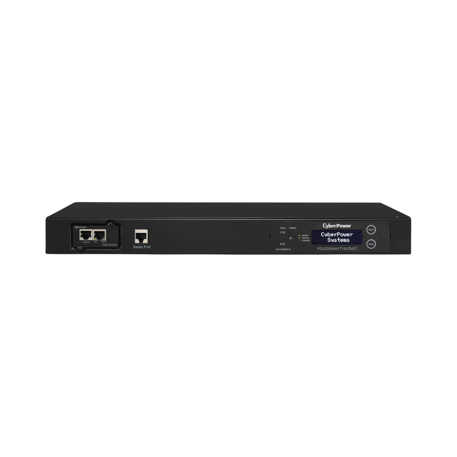 The CyberPower PDU20SWHVT10ATNET is a switched power distribution unit designed to deliver reliable and high-capacity power to servers, storage arrays, and network equipment. It provides 208 to 230 volts with a 24 amp derated capacity through eight rear outlets, including six IEC-320 C13 and two IEC-320 C19 receptacles. Its 10-foot power cord with a NEMA L6-30P twist lock plug offers flexibility in rack placement, while the compact 1U form factor fits well in dense data centers and tight spaces.