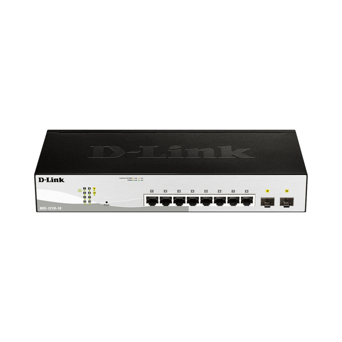 The D-Link DGS-1210-10 is a 10-port Gigabit Smart Managed Switch designed to deliver reliable and high-speed network connectivity for small to medium-sized businesses. It includes 8 Gigabit Ethernet ports and 2 SFP combo ports, enabling flexible connections to various devices and fiber network expansion. With a switching capacity of 20 Gbps, it efficiently handles multiple data streams, while its 1U rack-mountable design fits neatly into standard network racks, making it suitable for organized office environments.