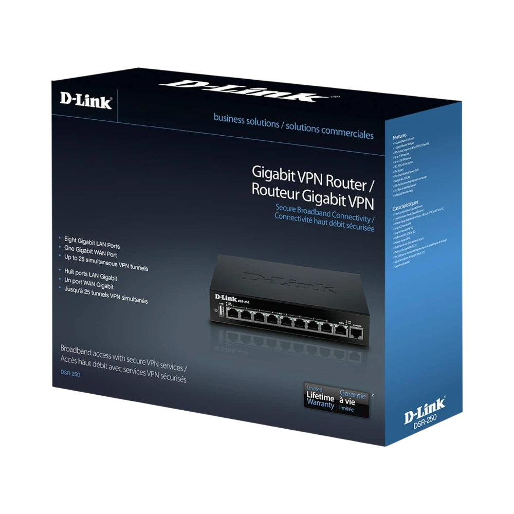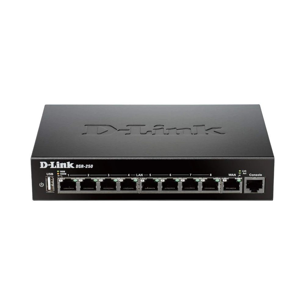 The D-Link DSR-250 is a gigabit router designed to deliver fast and reliable network performance for small to midsize businesses. It features eight Gigabit LAN ports and a Gigabit WAN port, supporting up to 20,000 concurrent sessions to maintain smooth traffic flow during peak usage. This router combines high-speed connectivity with robust VPN capabilities, making it suitable for offices that require secure remote access and consistent network responsiveness.
