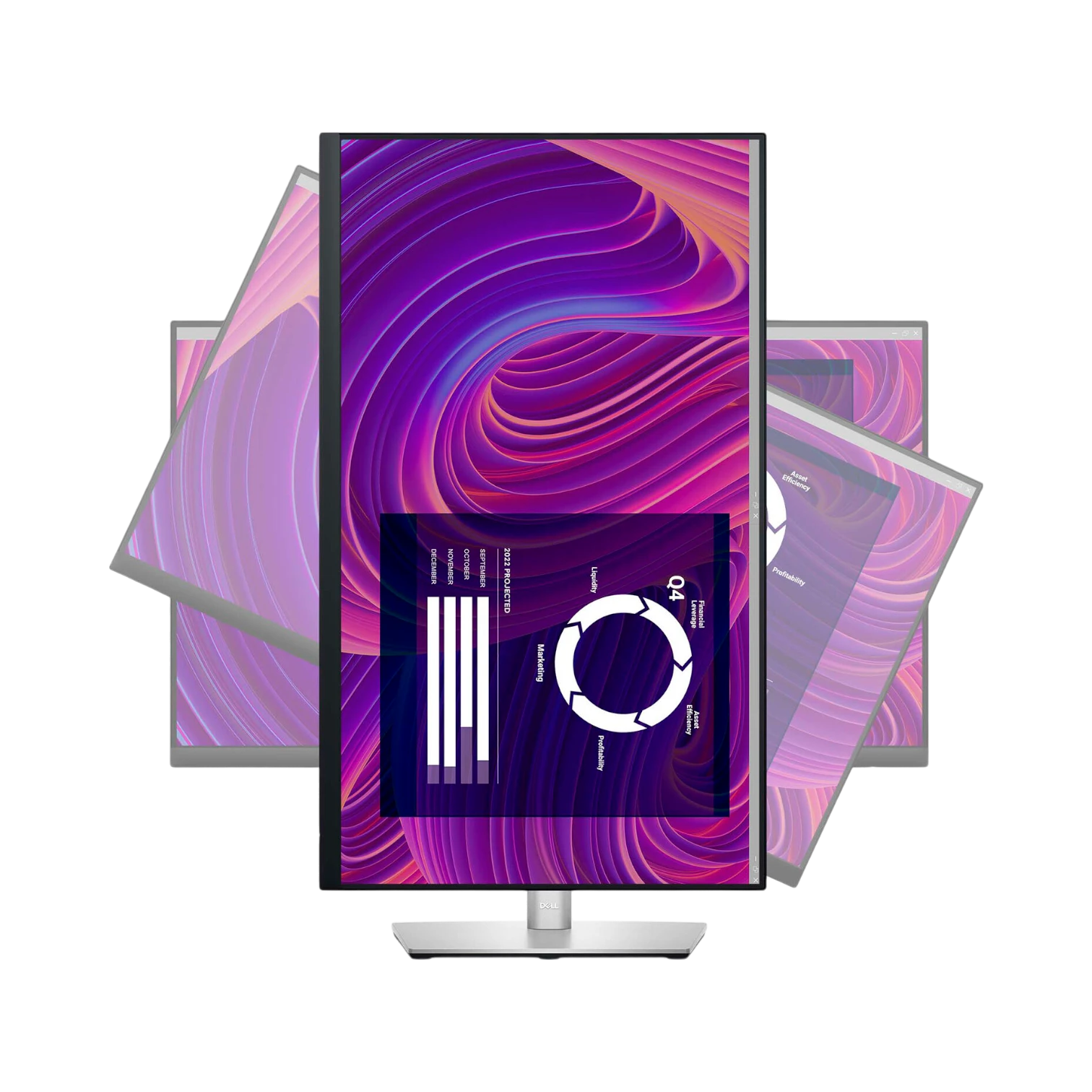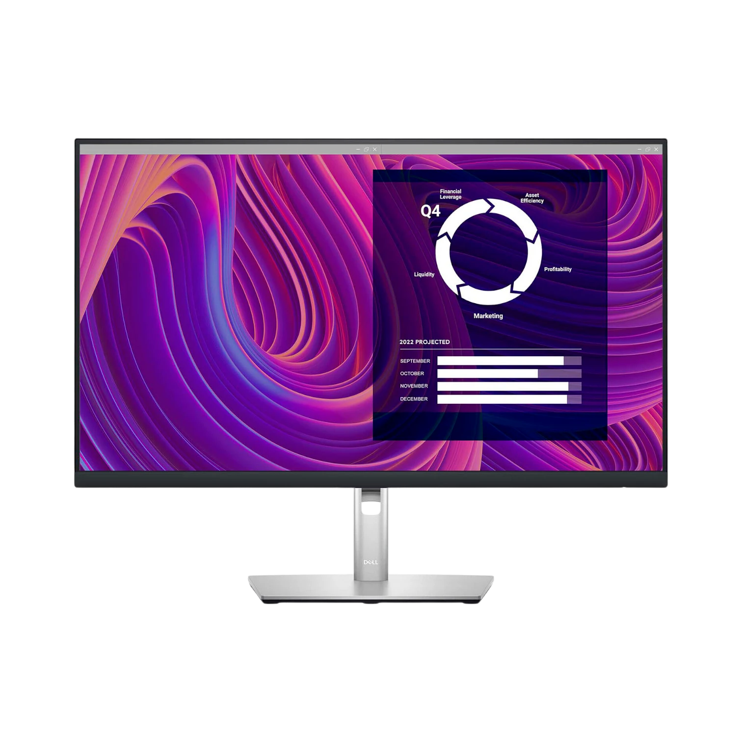 - Adjustable stand offers height, tilt, and swivel options to position the screen ergonomically for different users and work environments.