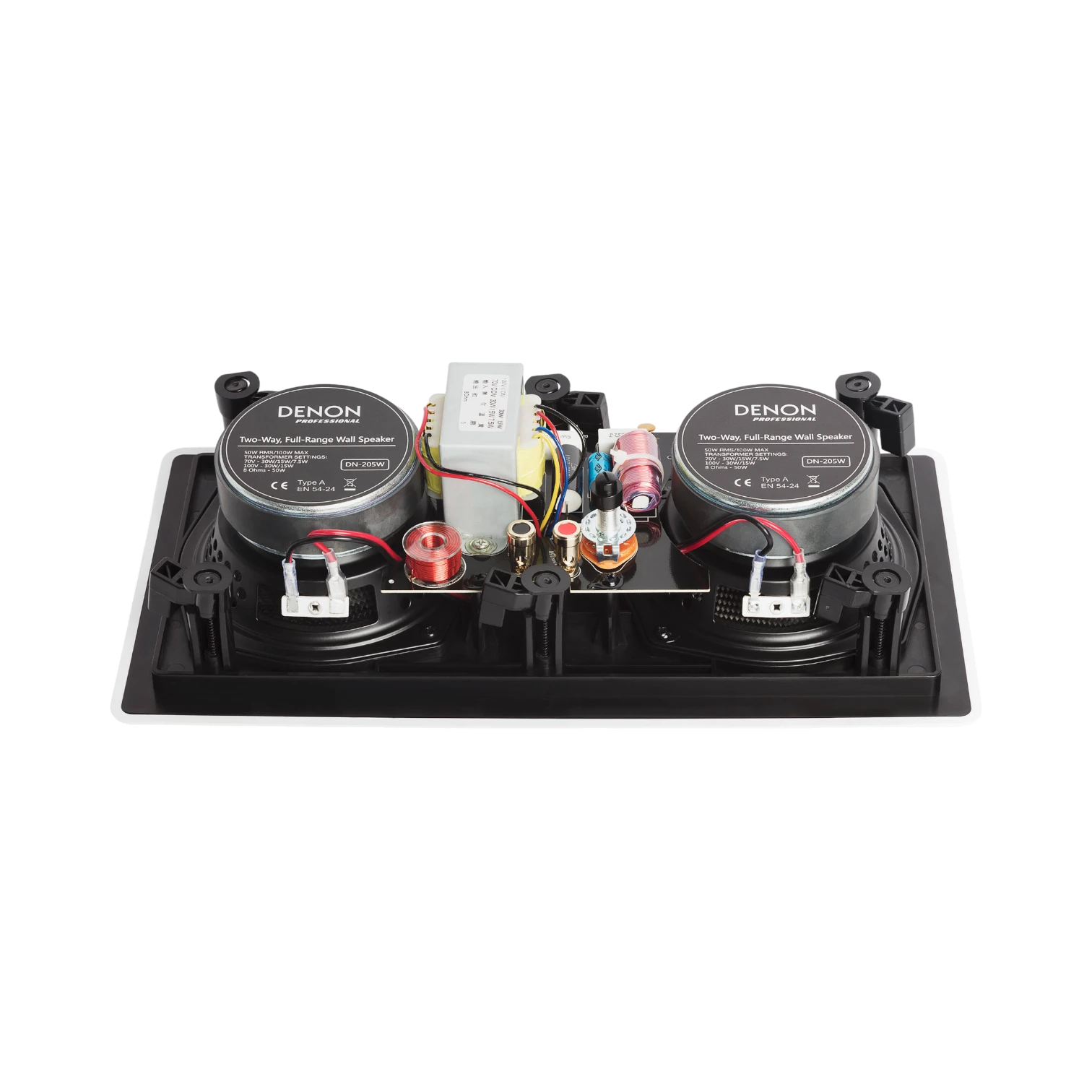 The Denon DN-205W is a two-way in-wall speaker designed to deliver clear and full-range sound while maintaining a discreet presence in any space. It features dual 5.25-inch carbon fiber woofers that provide tight and precise bass, complemented by a 1-inch aluminum tweeter with a silk dome for smooth and detailed highs. With a power handling capacity of 50 watts RMS and 100 watts peak, this speaker is well suited for environments like restaurants, retail stores, classrooms, and boardrooms where quality audio is needed without visible clutter.