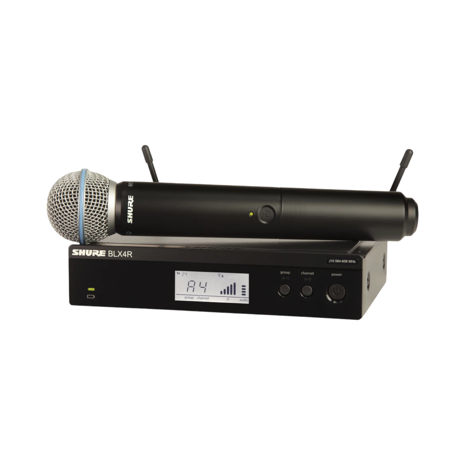 The Shure BLX24R/B58-H9 is a wireless handheld microphone system designed to deliver clear and reliable vocal performance for singers, speakers, and hosts. It combines the professional-grade Beta 58A dynamic capsule with a rack-mountable BLX4R receiver, offering up to 14 hours of battery life and a 300-foot line-of-sight range. This system is ideal for venues such as small clubs, houses of worship, corporate events, and wedding receptions where dependable sound and easy setup are essential.