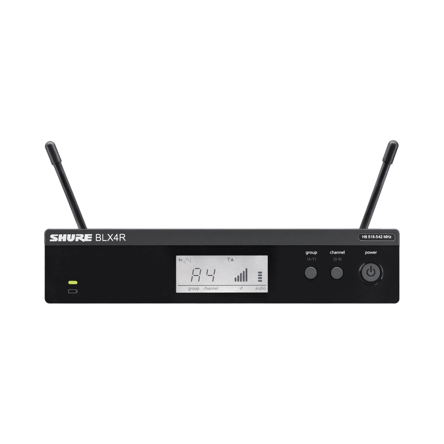 - BLX4R receiver fits into a single rack space and features a bright LCD screen displaying signal strength, audio levels, and channel information