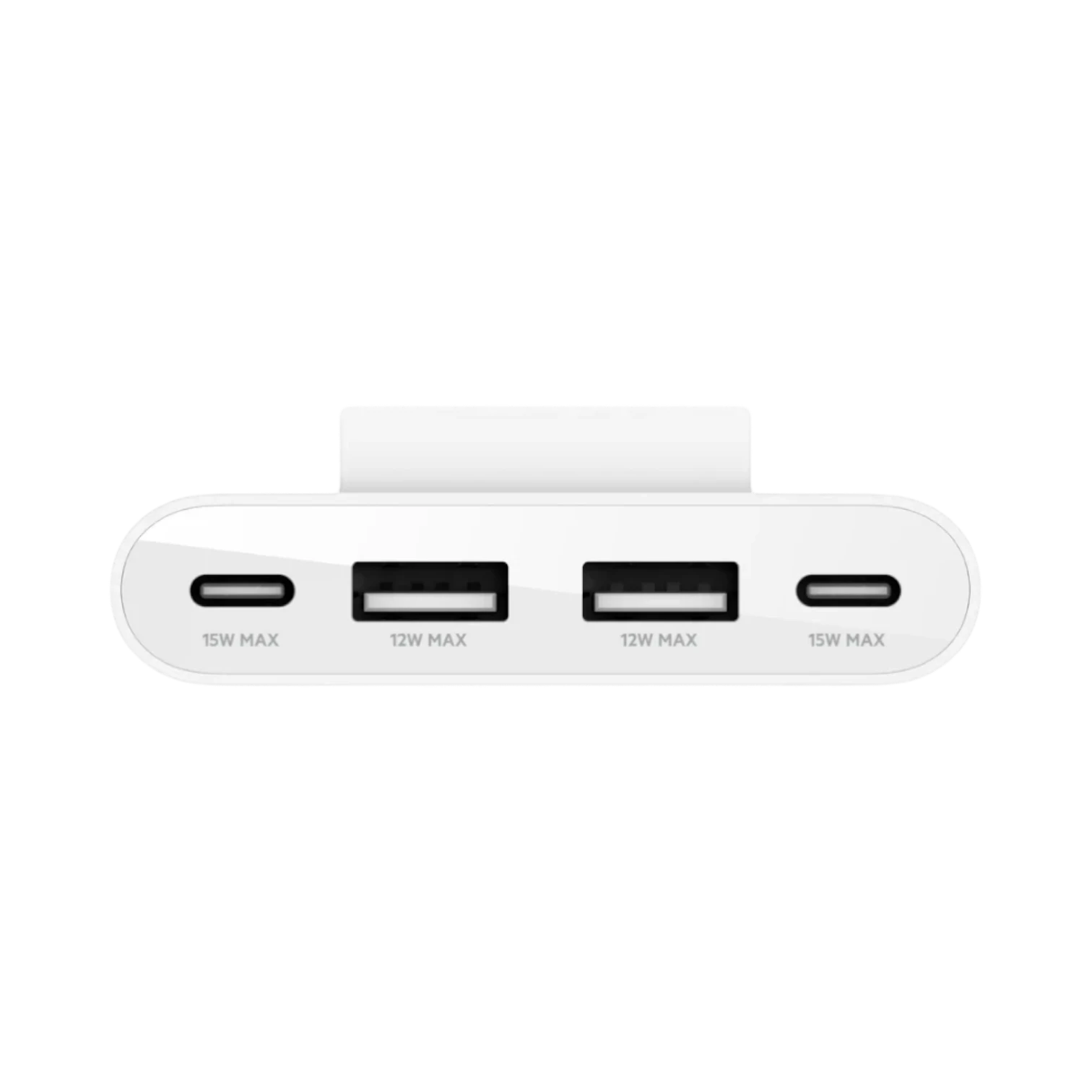 The Belkin BUZ001TT2MWHB7 is a four-port USB charging hub designed to power multiple mobile devices simultaneously from a single outlet. It delivers a combined 30W output, with two USB-C ports providing up to 15W each and two USB-A ports supplying up to 12W each. This setup ensures steady and efficient charging for phones, tablets, earbuds, and handheld game consoles, making it a practical solution for home, office, or travel use.