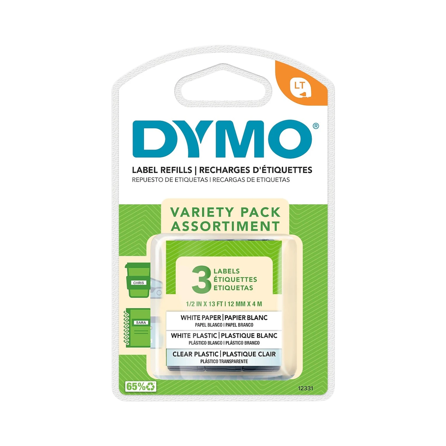 The DYMO 12331 is a label tape variety pack designed for use with DYMO LetraTag label makers, providing a versatile solution for creating clear and durable labels. This pack includes three rolls of tape, each 1/2 inch wide and 13 feet long, suitable for organizing files, storage containers, school supplies, and craft projects. The different tape materials offer options for various labeling needs, from everyday office use to more durable applications.