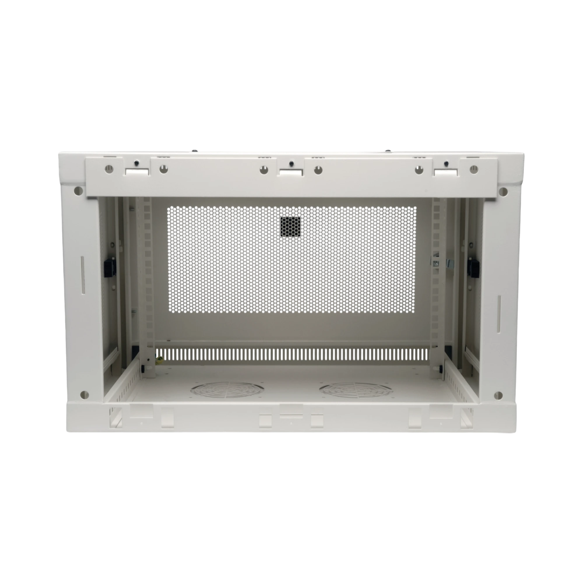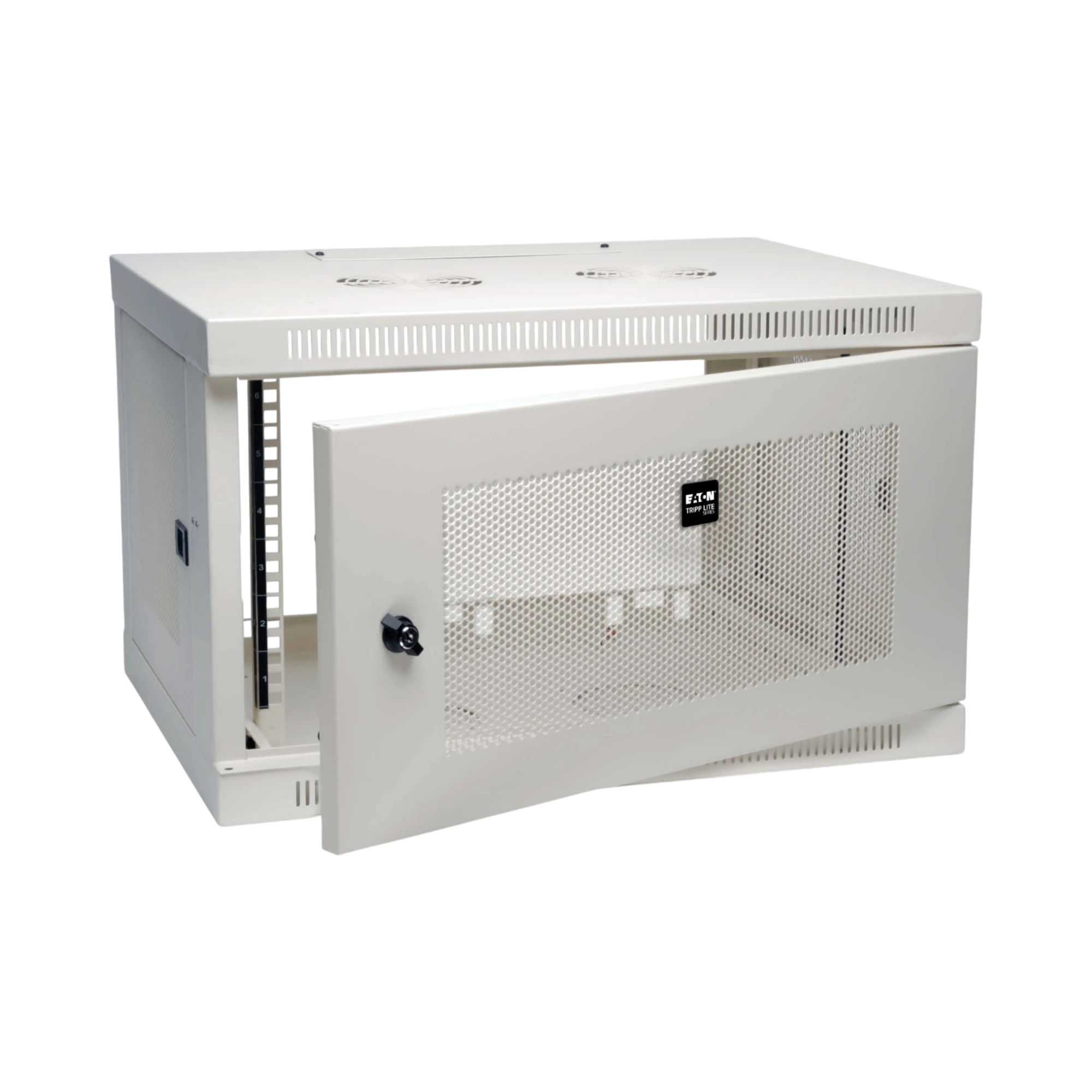The Tripp Lite SRW6UW is a low-profile wall-mount rack enclosure designed to provide six rack units of EIA-standard 19-inch space for networking equipment. Its shallow depth and compact design make it ideal for environments where space is limited, such as home offices, classrooms, retail counters, and small network closets. The enclosure supports equipment up to 200 pounds and features a white powder-coated steel exterior that blends well with light-colored interiors.