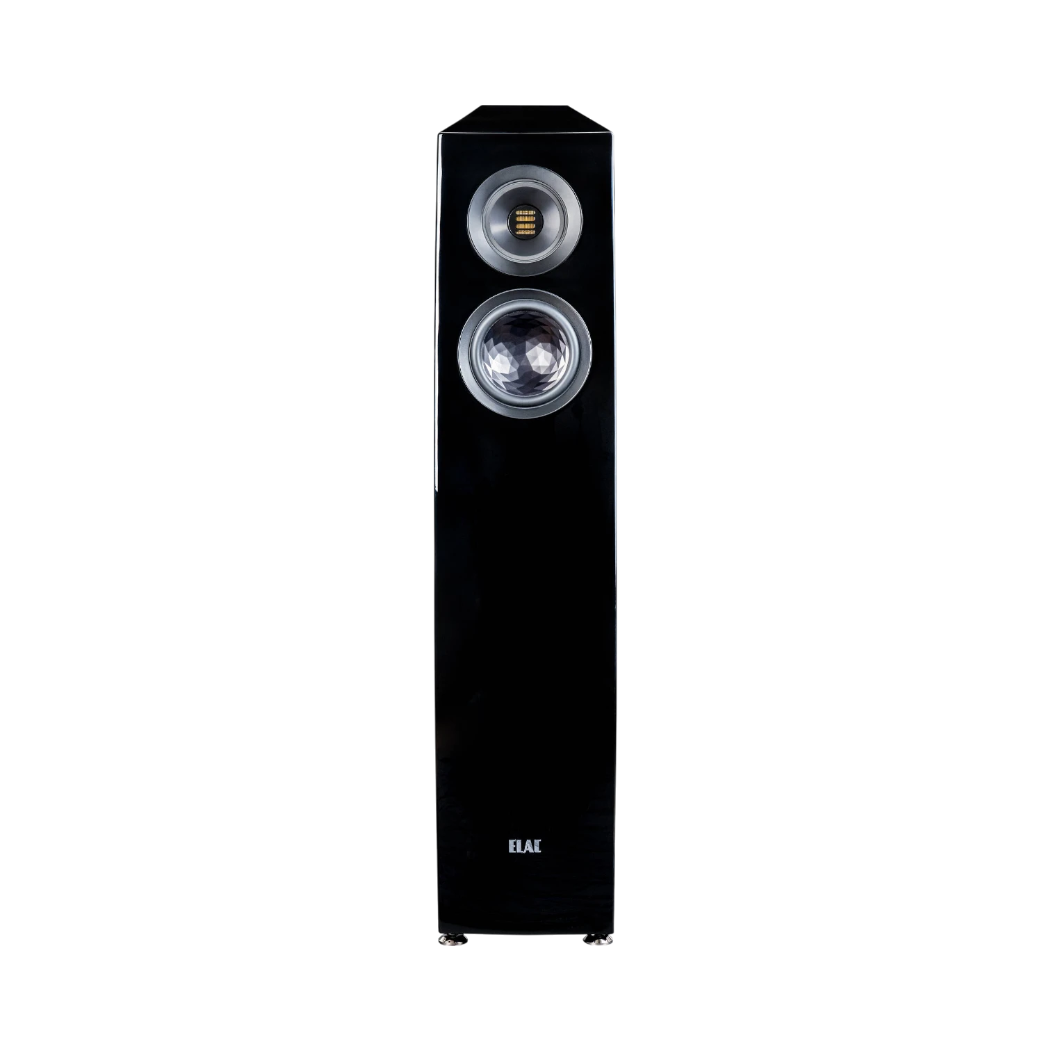 Its trapezoidal shape and black high gloss finish offer a refined look that fits well in modern or traditional living spaces. The sturdy bottom assembly enhances stability and reduces vibrations, while stepX-JET technology allows you to adjust the speaker’s directivity to match your room’s acoustics and seating arrangement.