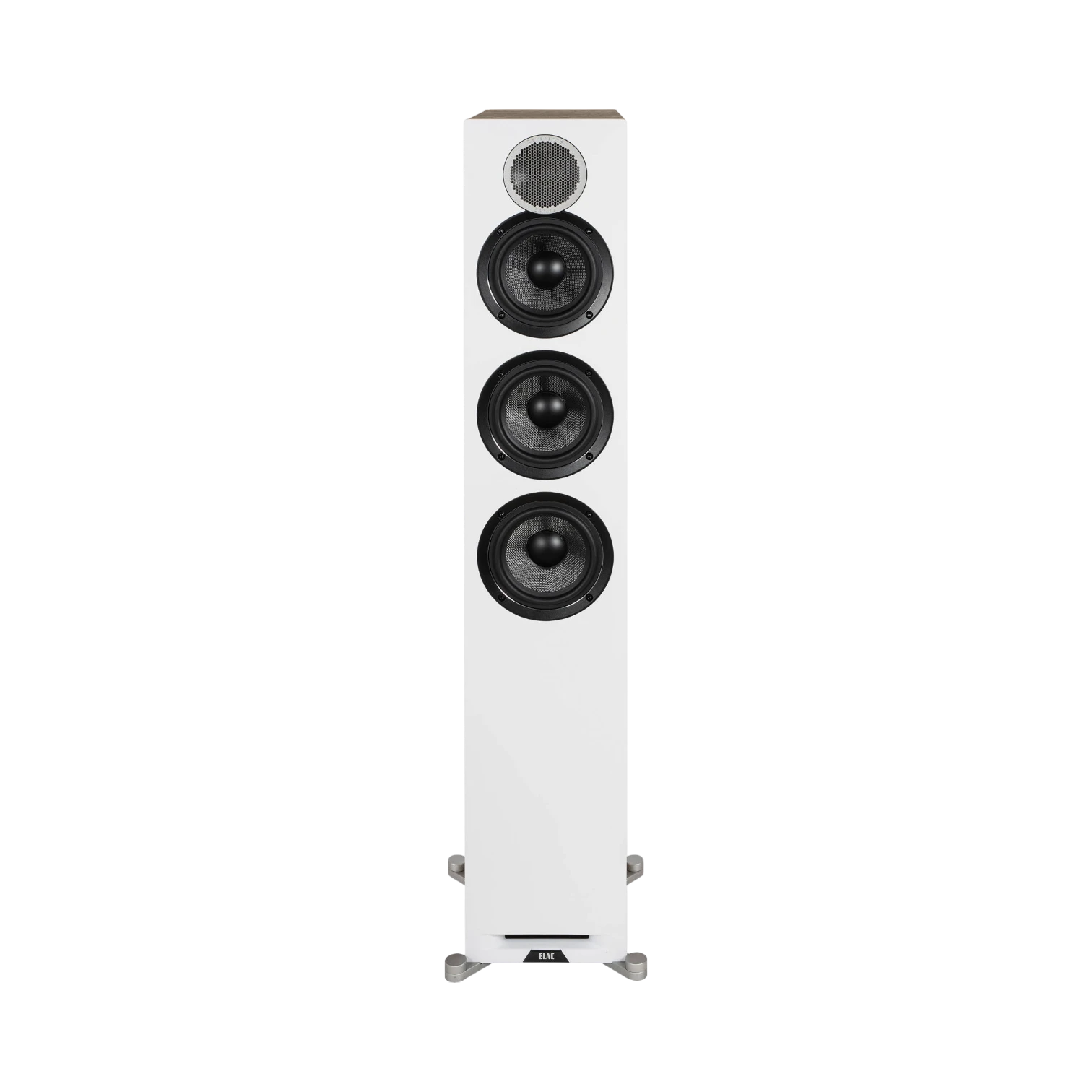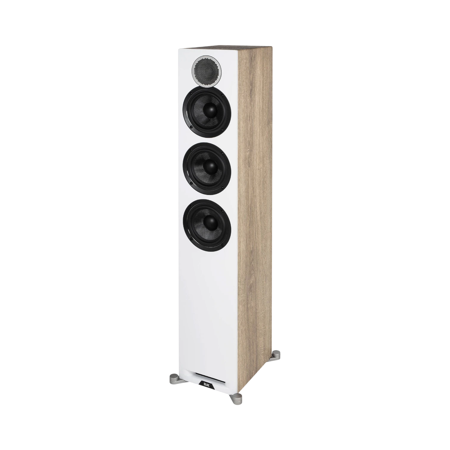 The ELAC DFR52-W is a three-way floorstanding speaker designed to deliver reference-level sound with a natural presence that complements modern living spaces. It features a white front baffle paired with an oak cabinet, creating a warm and contemporary aesthetic that fits seamlessly into a variety of room styles. With a frequency response spanning from 42 Hz to 35 kHz and power handling up to 140 watts at 6 ohms, this speaker offers detailed audio performance suitable for both music and home theater applications.