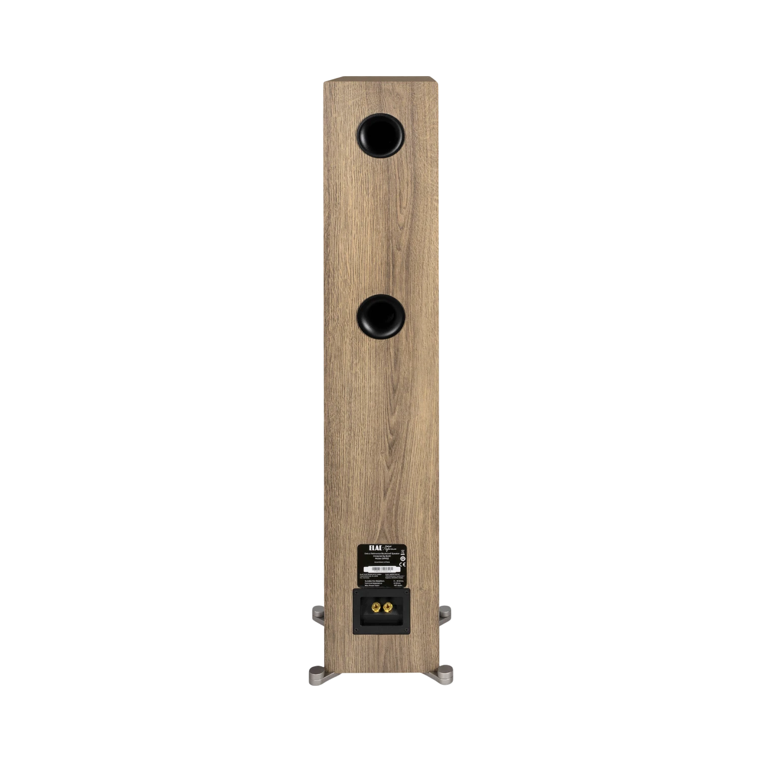 - Cabinet material: MDF with oak finish and white front baffle