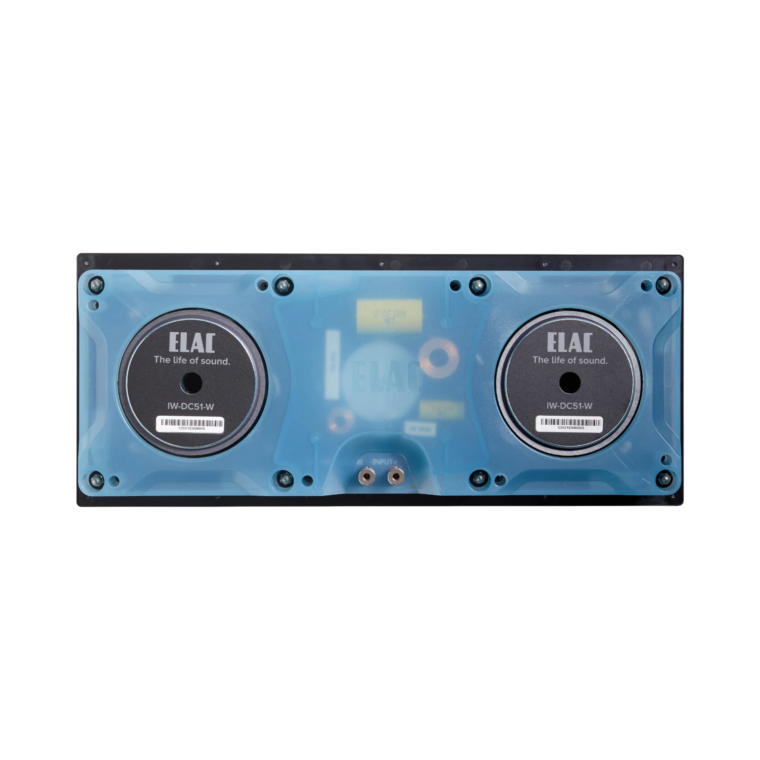 The ELAC IW-DC51-W is an in-wall center channel speaker designed to deliver clear and focused dialogue for home theater systems while maintaining a clean, unobtrusive look. It features two 5.25 inch aramid fiber woofers and a 1 inch soft dome tweeter, covering a frequency range from 45 Hz to 20 kHz. With power handling between 30 and 120 watts and a nominal impedance of 6 ohms, it integrates smoothly with most home theater receivers and fits flush inside standard wall cavities.