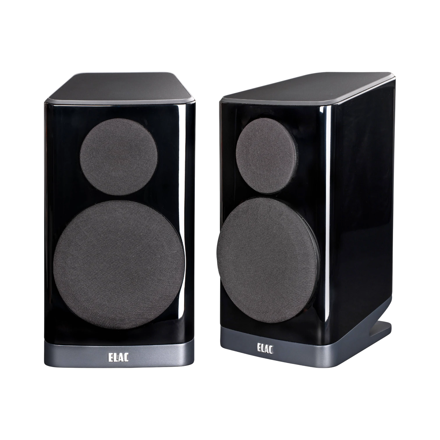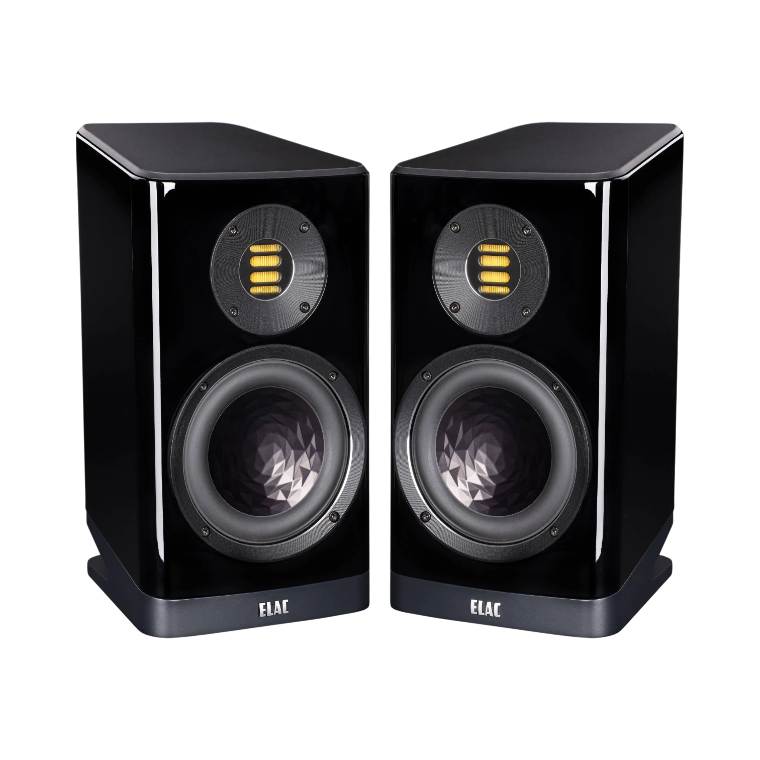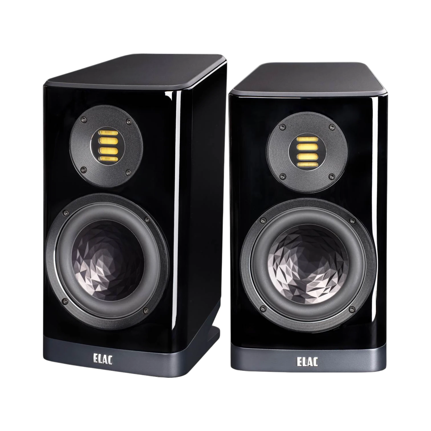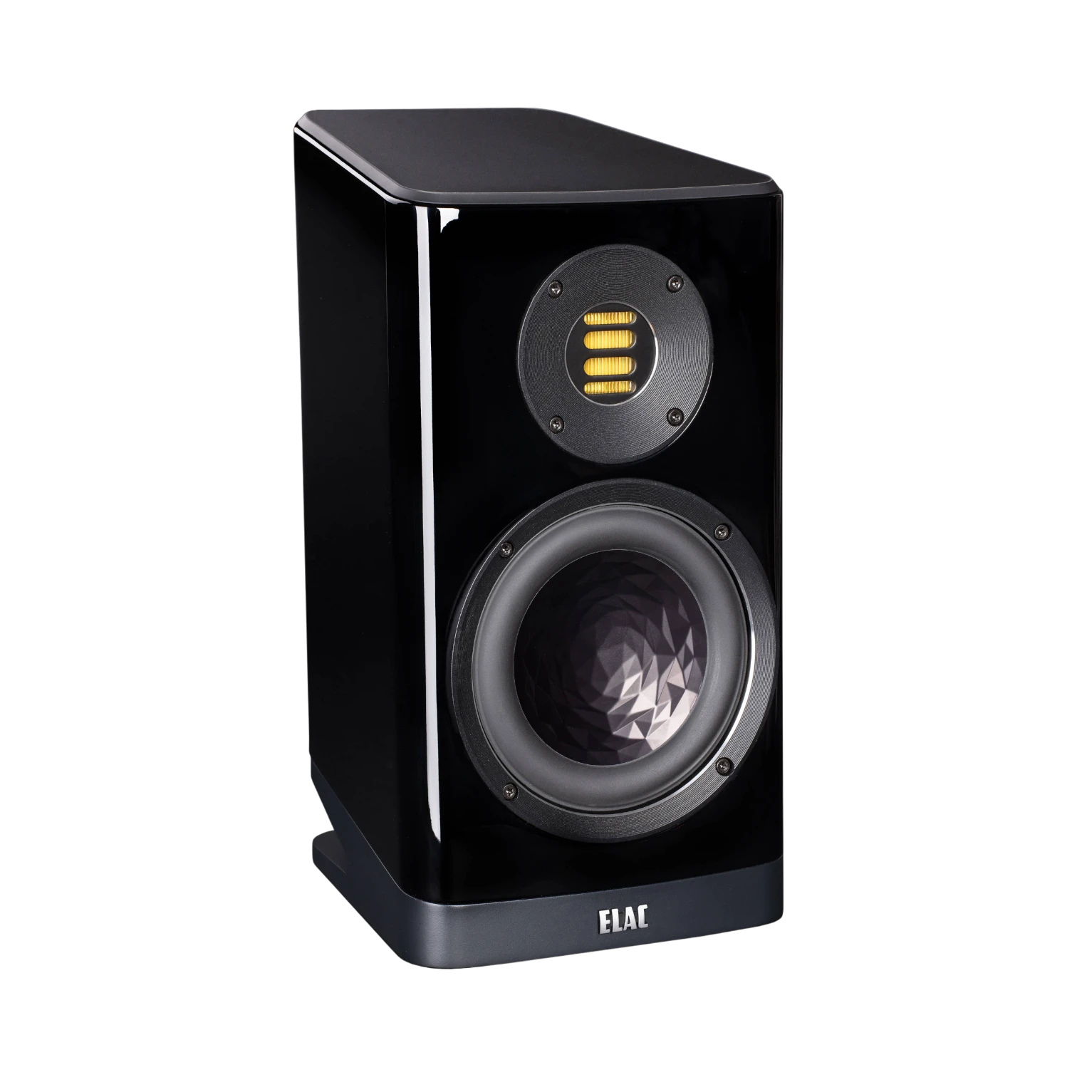The ELAC Vela BS 403 (VBS403-GB) is a pair of bookshelf speakers designed to deliver clear and detailed sound with a two-way configuration that combines a hand-assembled JET 5 folded-ribbon tweeter and a 5.9-inch aluminum and paper cone woofer. This combination produces crisp highs and rich bass, covering a wide frequency range from 41 Hz to 50 kHz. Their trapezoid-shaped cabinet with a down-firing bass reflex port enhances sound quality and allows flexible placement in various room settings. Finished in gloss black, these speakers blend modern style with high performance, making them suitable for audiophiles and home audio enthusiasts alike.
