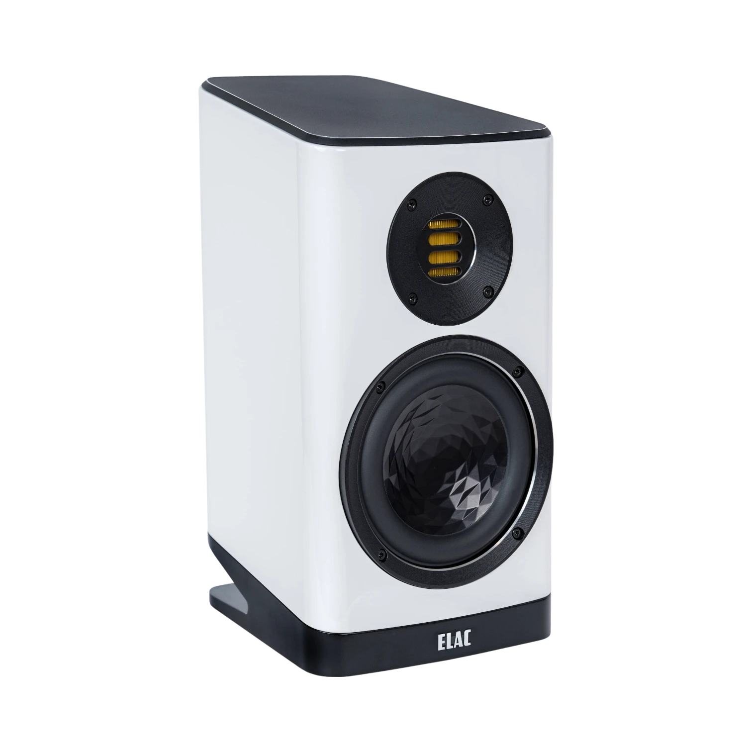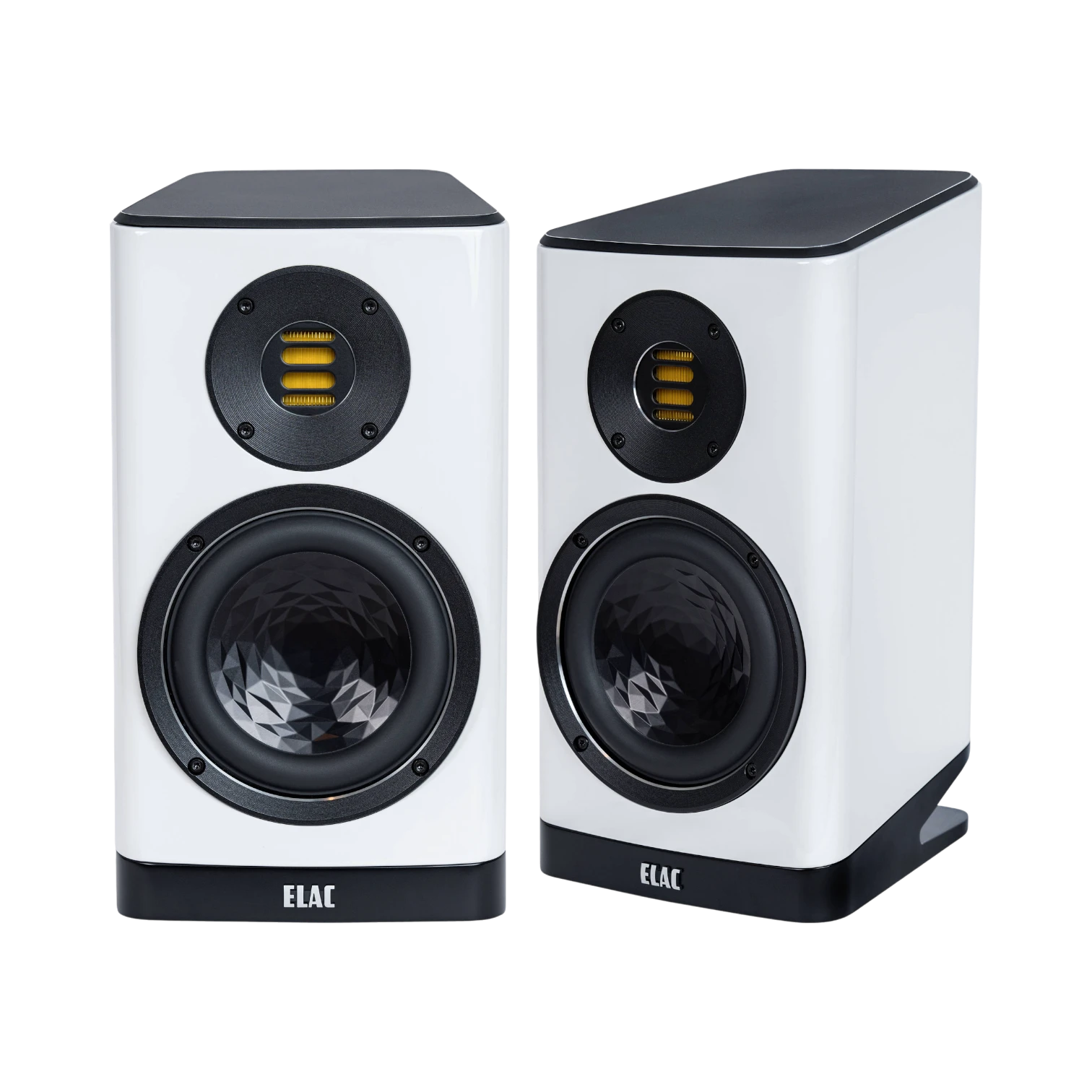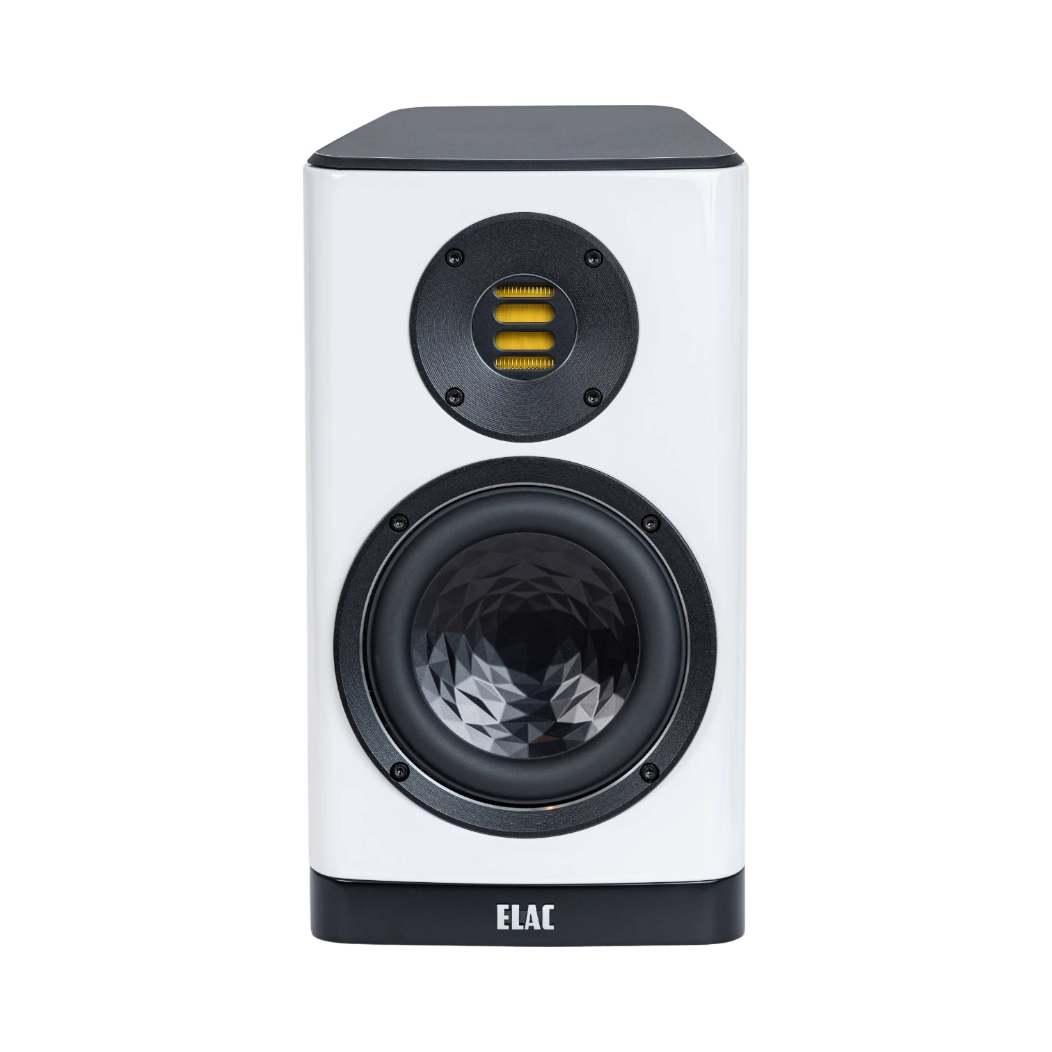 The ELAC VBS403-GW is a pair of two-way bookshelf speakers designed to deliver clear, fast sound with balanced bass from a compact enclosure. Featuring a JET 5 folded ribbon tweeter and a 5.9-inch aluminum and paper sandwich cone woofer, these speakers cover a wide frequency range from 41 Hz to 50 kHz, allowing you to hear deep bass notes alongside detailed high frequencies. Their trapezoid cabinets reduce internal resonances, while the down-firing bass reflex ports enable flexible placement without sacrificing low-frequency performance.