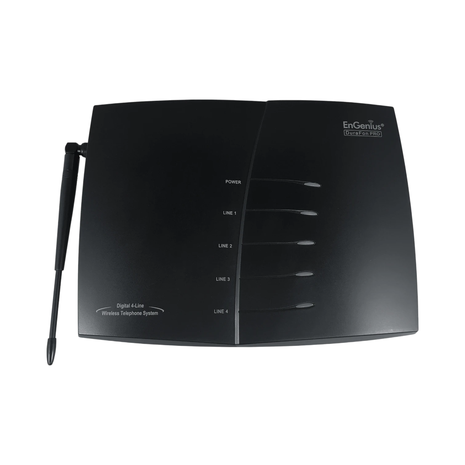 The EnGenius DURAFONPRO-BU is a base unit for a long-range multi-line expandable cordless phone system designed to deliver reliable voice coverage over vast areas. It supports up to four separate phone lines and integrates seamlessly with PBX, VoIP, PSTN, FXS, or standard POTS services, making it adaptable to a wide range of telephone infrastructures. This base unit provides coverage inside buildings up to 250,000 square feet, penetrates through as many as 12 concrete or steel-reinforced floors, and extends voice communication across 3,000 acres outdoors, ensuring staff can stay connected across large facilities without interruption.