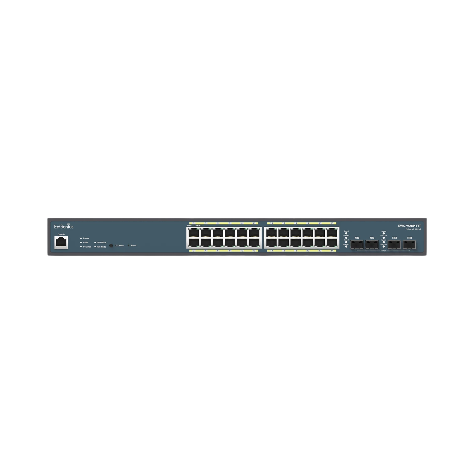 The EnGenius EWS7928P-FIT is a managed network switch designed to deliver reliable power and high-speed connectivity in environments such as small offices, retail floors, and classrooms. It features twenty-four Gigabit Ethernet ports with PoE Plus support, each capable of supplying up to 30 W of power, and a total PoE budget of 240 W. This makes it ideal for powering devices like IP cameras, wireless access points, and VoIP phones over a single cable. Additionally, four dedicated SFP uplink ports enable fiber connections for long-distance or high-bandwidth network backbones.