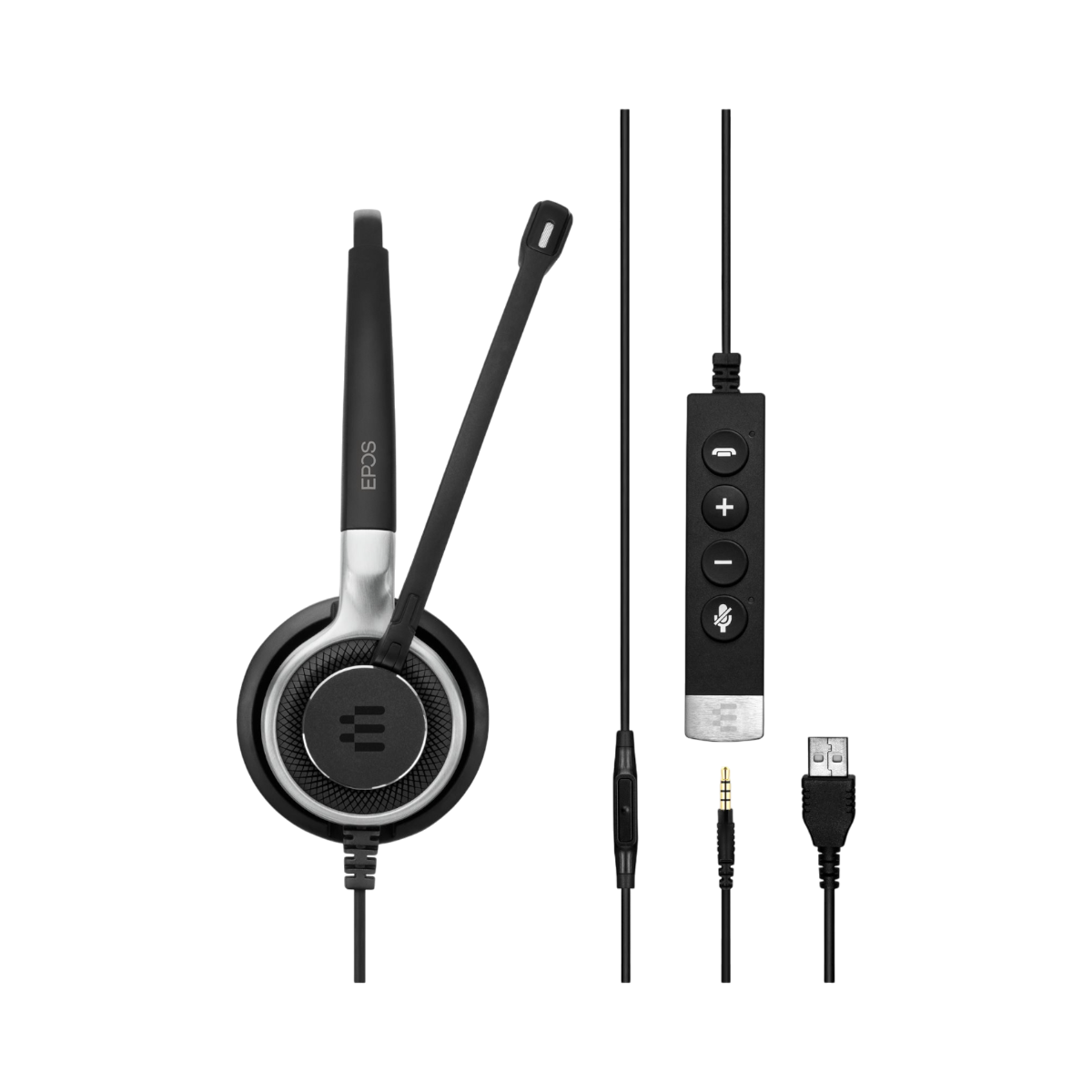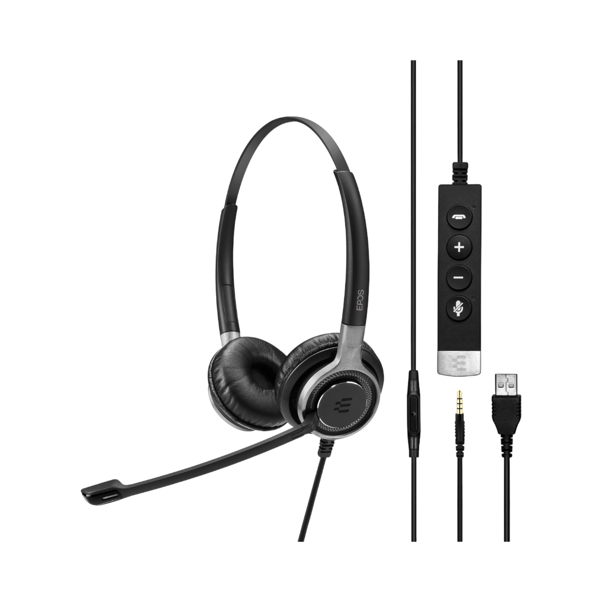 The EPOS 1000645 is a wired headset designed for professionals who need clear communication in noisy environments. It features double-sided ear cups for natural stereo sound and offers both USB and 3.5 mm connections, allowing seamless switching between computers, softphones, tablets, and phones. The headset combines EPOS Voice technology with an ultra noise-canceling microphone to ensure your voice is heard clearly, even amid office distractions.
