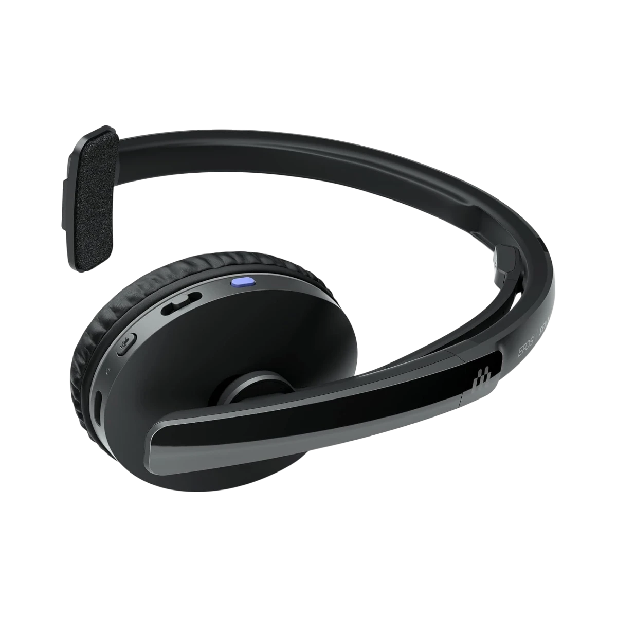 The EPOS 1000881 is a wireless Bluetooth on-ear headset designed to provide seamless communication across multiple devices. It includes a USB-A dongle for straightforward plug-and-play connection to your computer, while also supporting direct Bluetooth pairing with mobile phones. This headset can maintain simultaneous connections to two devices, allowing you to switch effortlessly between calls on your laptop and smartphone without interruption. Its single-sided design with a soft leatherette ear cushion offers comfort during extended use and passive noise reduction to minimize background distractions.