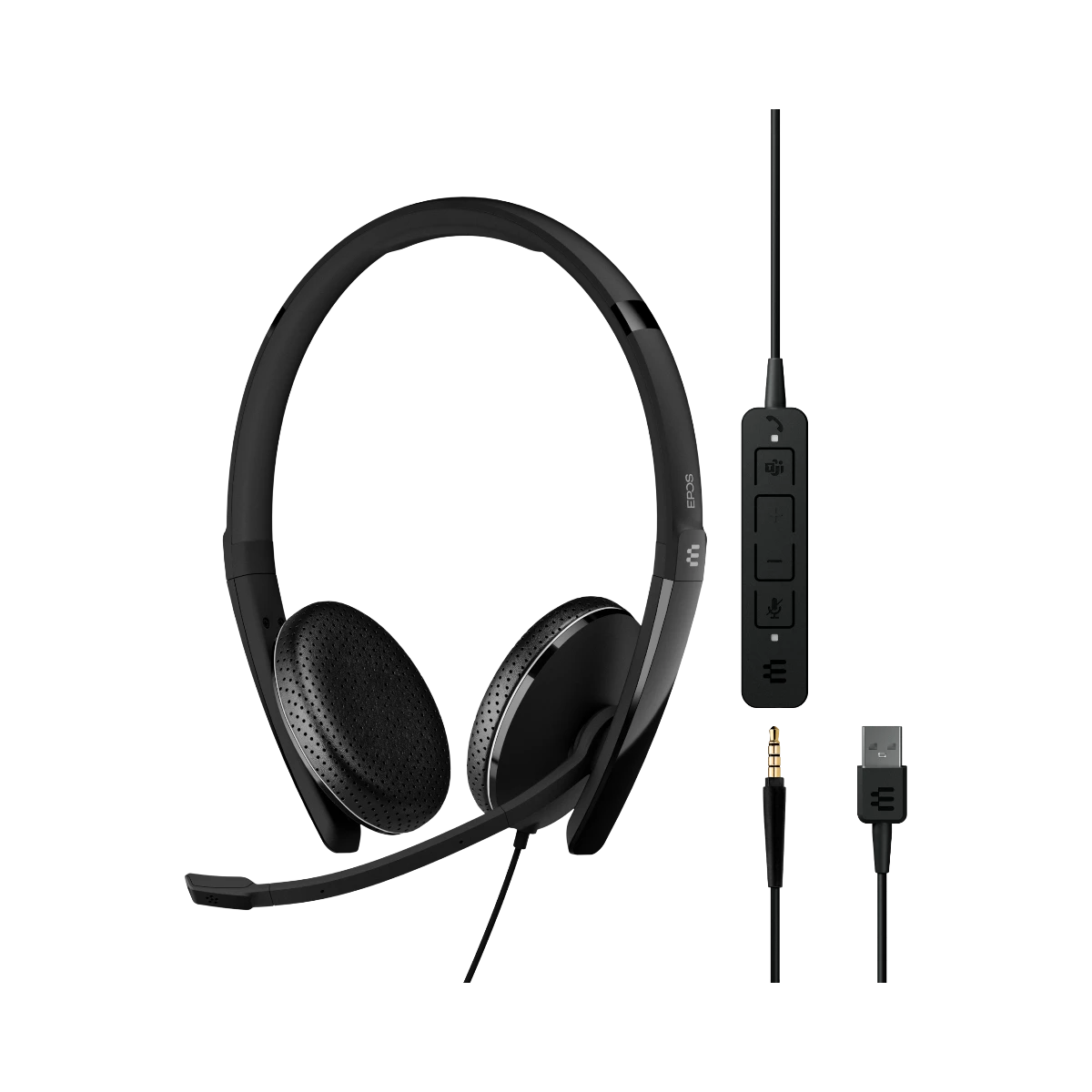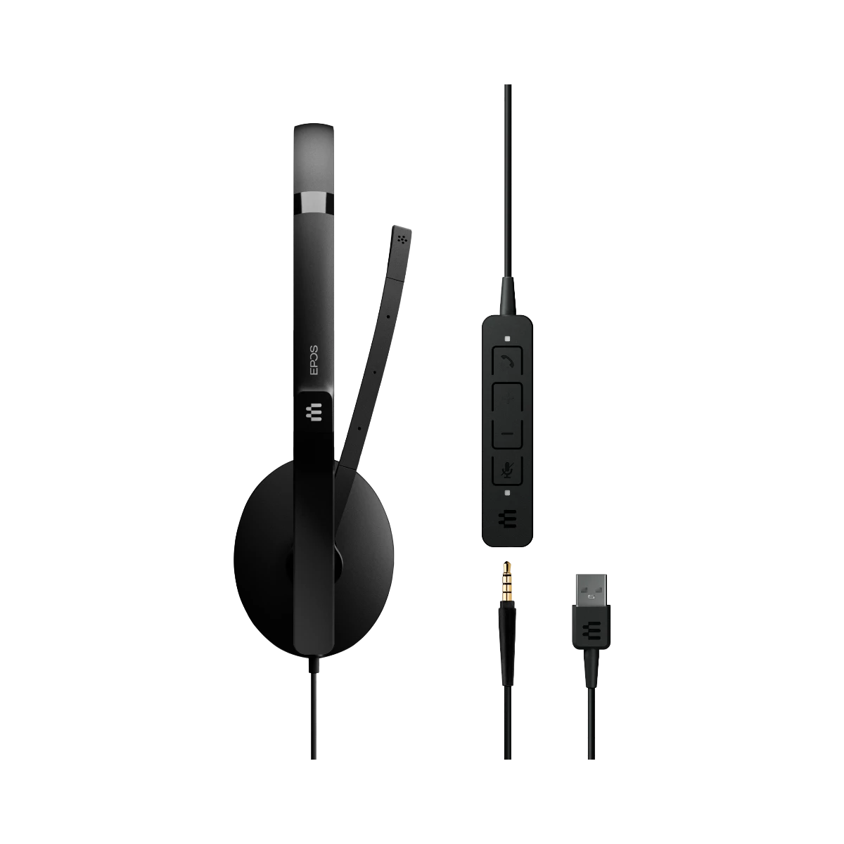The EPOS 1000901 is a stereo wired headset designed for professionals who work across home, office, and mobile environments. It connects via a USB cable and is certified for Microsoft Teams, enabling instant call access and seamless communication. The headset features lightweight ear cups that provide sound isolation and comfort, with options for leatherette or foam ear pads and an adjustable headband to ensure a secure fit during extended use.